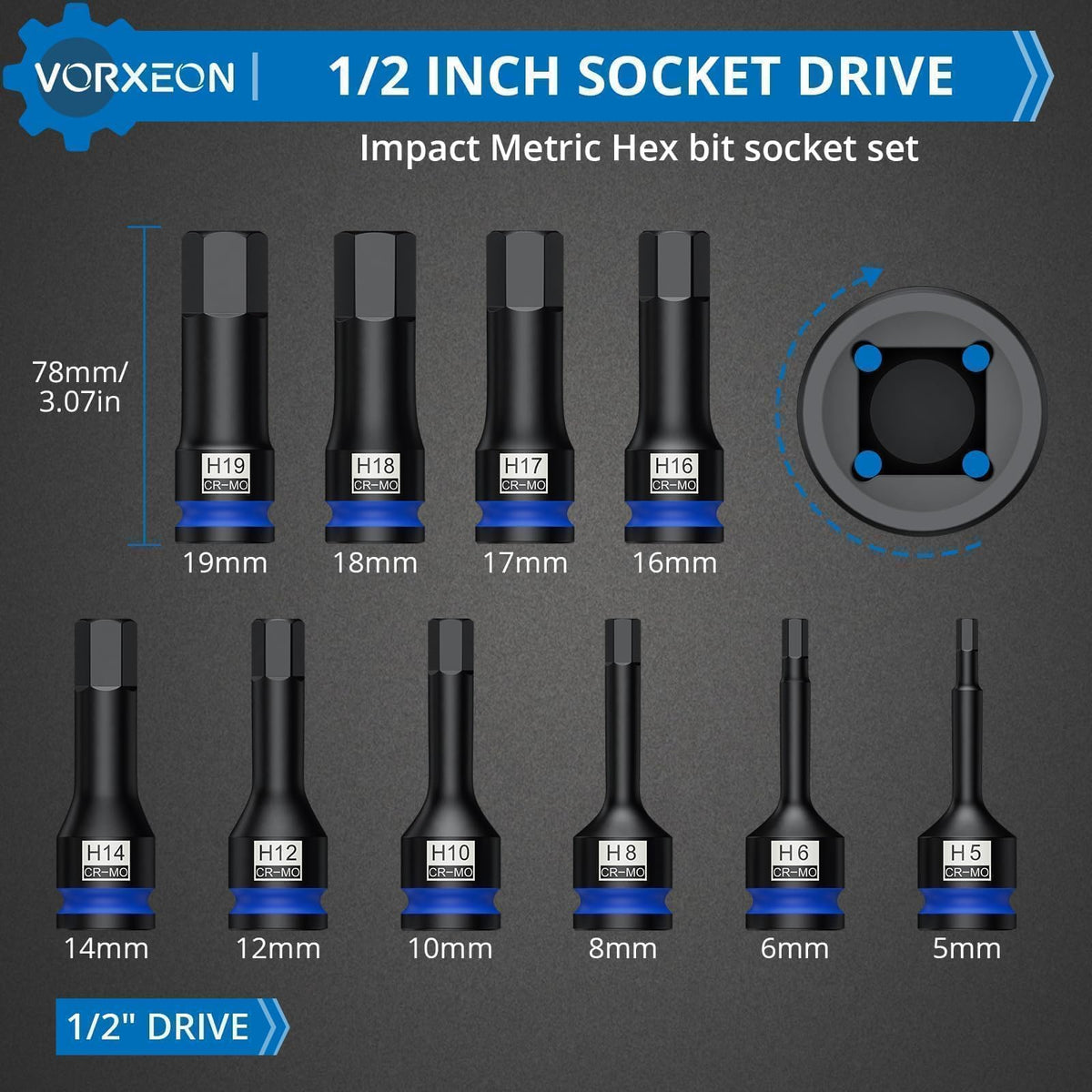 Vorxeon 10Pcs 1/2' Drive Metric Impact Allen Hex Bit Socket Set 42Crmo With Storage Case 5Mm 6Mm 8Mm 10Mm 12Mm 14Mm 16Mm 17Mm 18Mm 19Mm