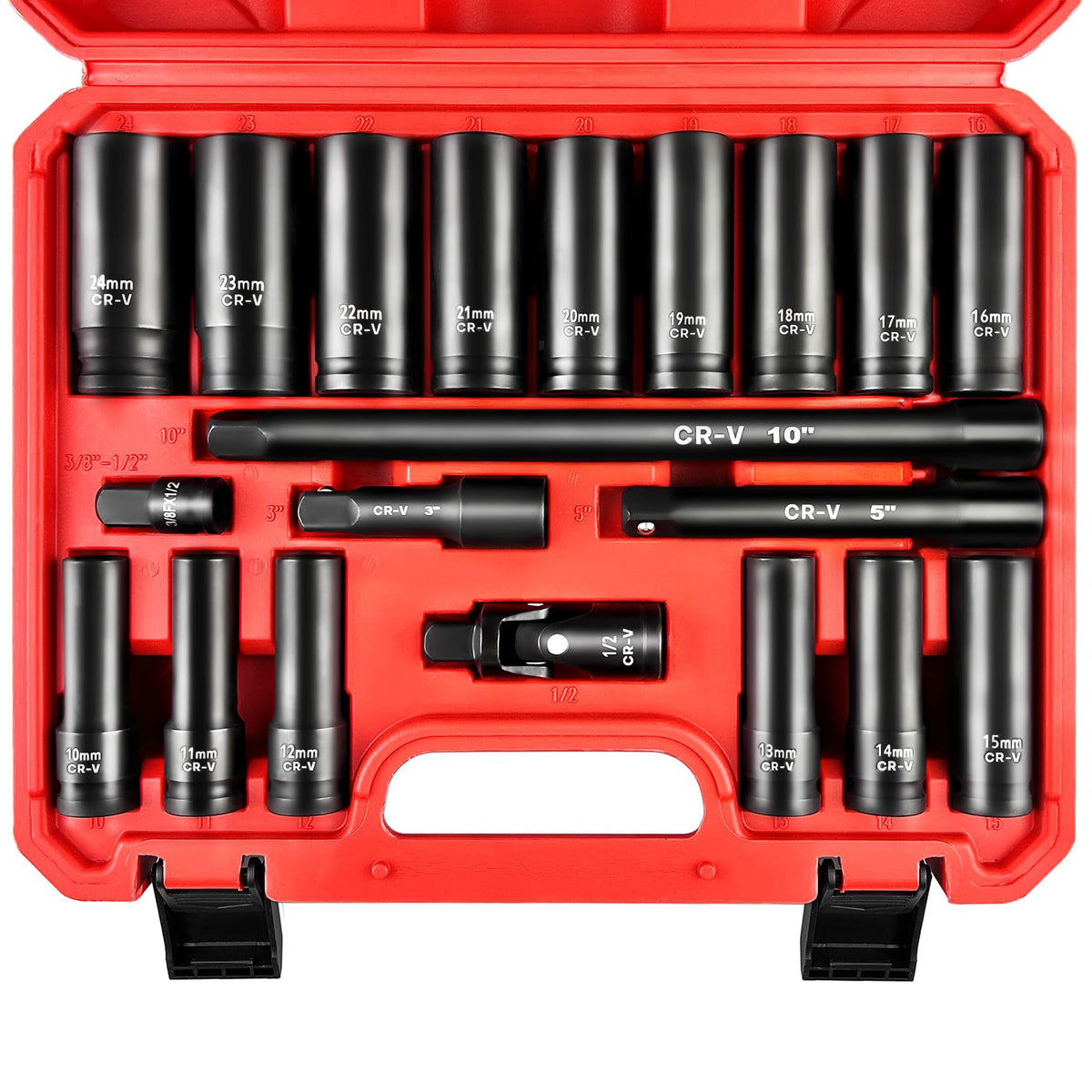?Package Include?: Metric socket: 10mm, 11mm, 12mm, 13mm, 14mm, 15mm, 16mm, 17mm, 18mm, 19mm, 20mm, 21mm, 22mm, 23mm, 24mm. Accessory: Extension Bar 3', 5', 10'; Universal Joint 1/2'; Adapter 3/8'-1/2'.?Material?The impact socket set are made of high quality chrome vanadium steel, with black phosphate finish, strong and durable; not easy to rust or corrode.?6-Point?6 point design are easier to embed, opening grips flat sides of fasteners, not corners, preventing round-off.?Size Clearly?Permanently laser etched and easy to read, even in low light.?Easy to carry?The drive socket set can easy to transport,safe storage and quick organization.