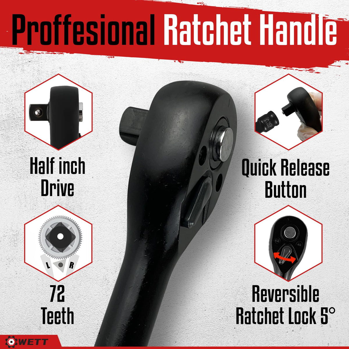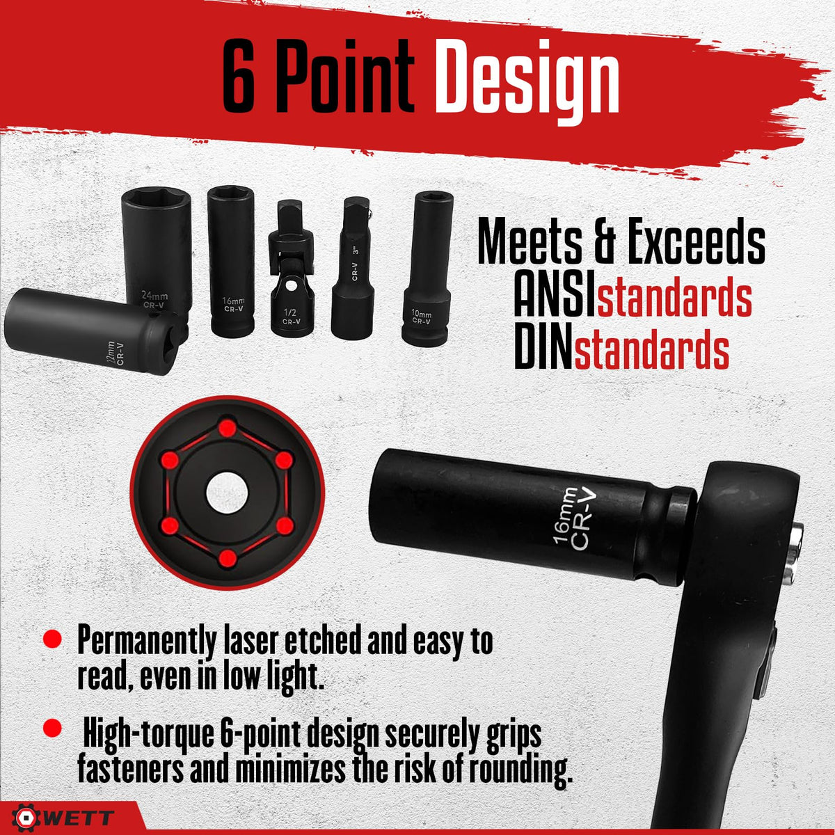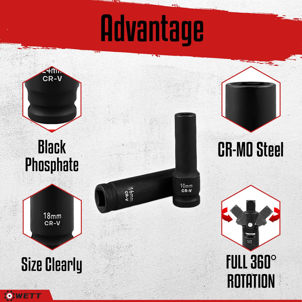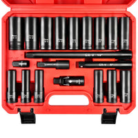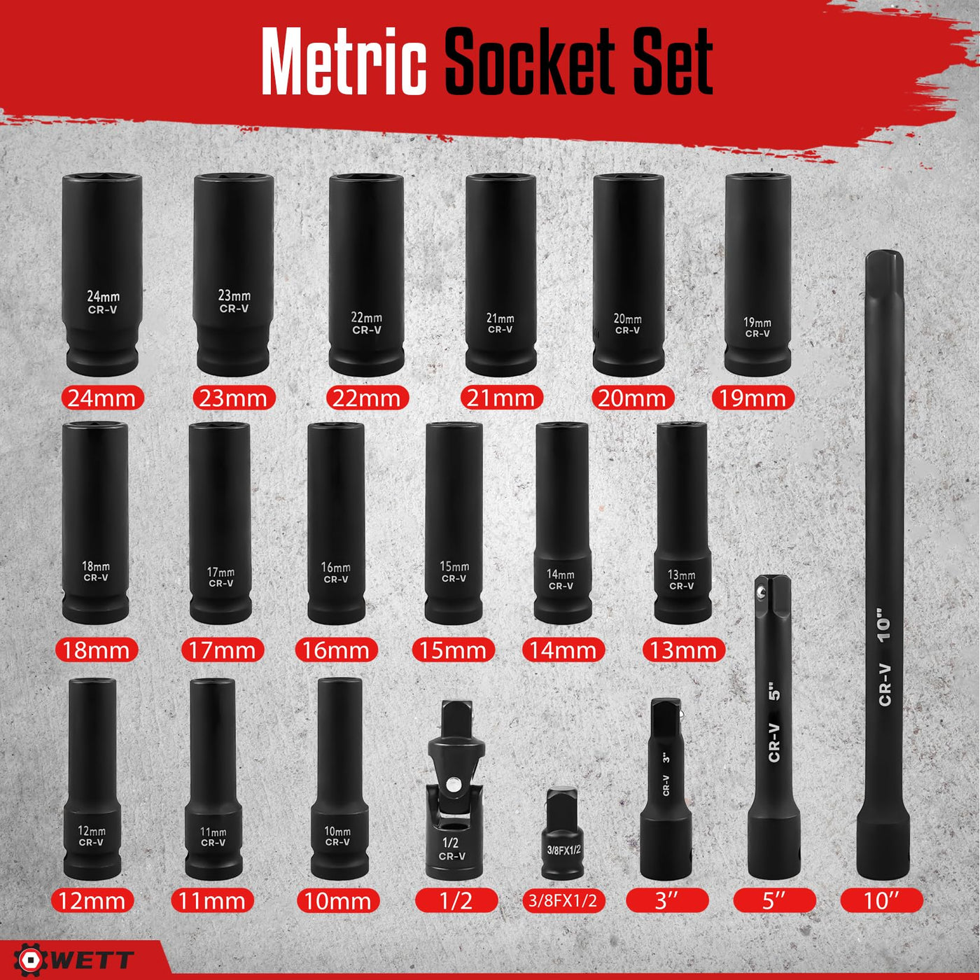 Wett 1/2-Inch Drive Deep Impact Socket Set, 20 Piece Metric Socket Set, 6 Point, Cr-V Steel, 10-24Mm, Universal Joint, Adapter And Extension Bar