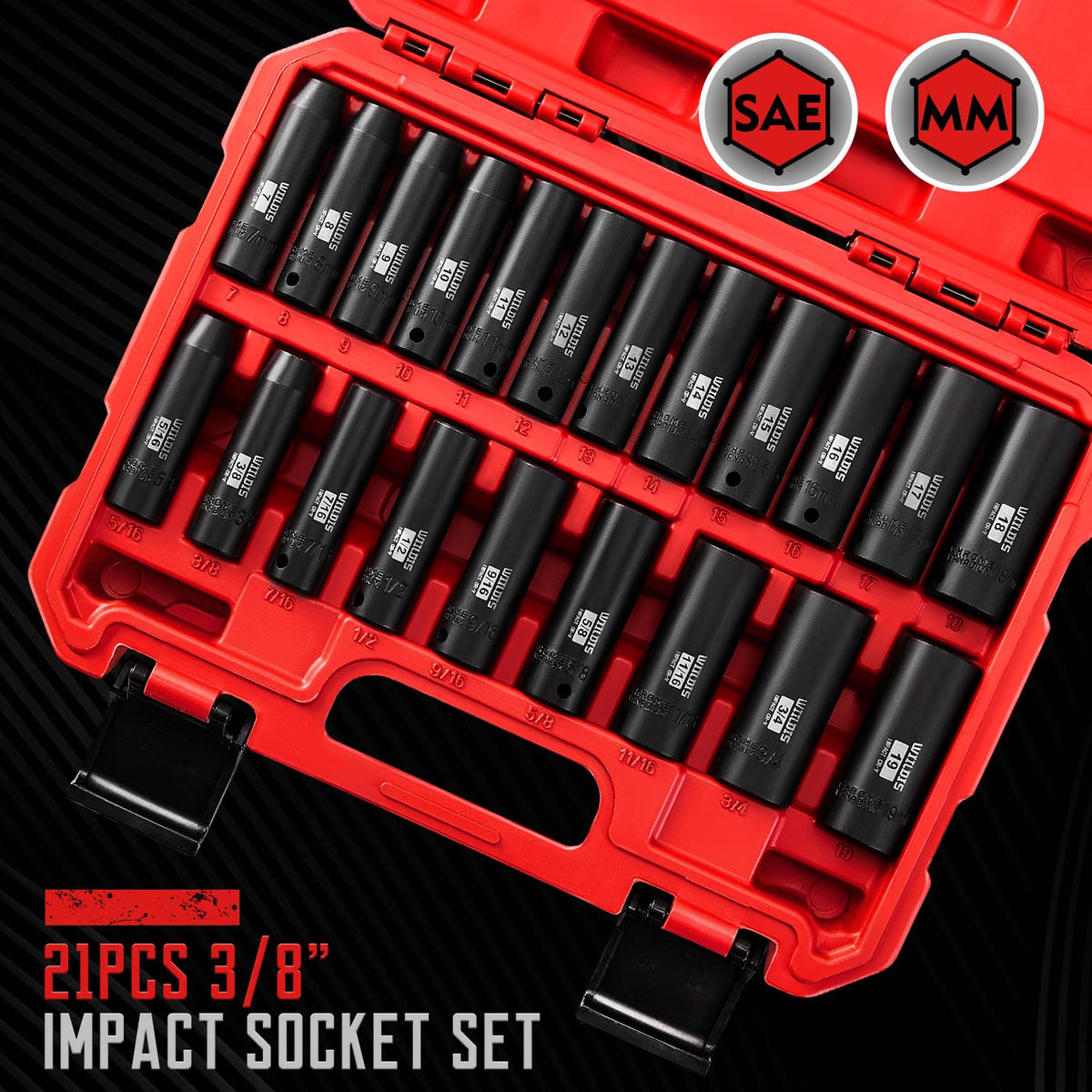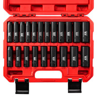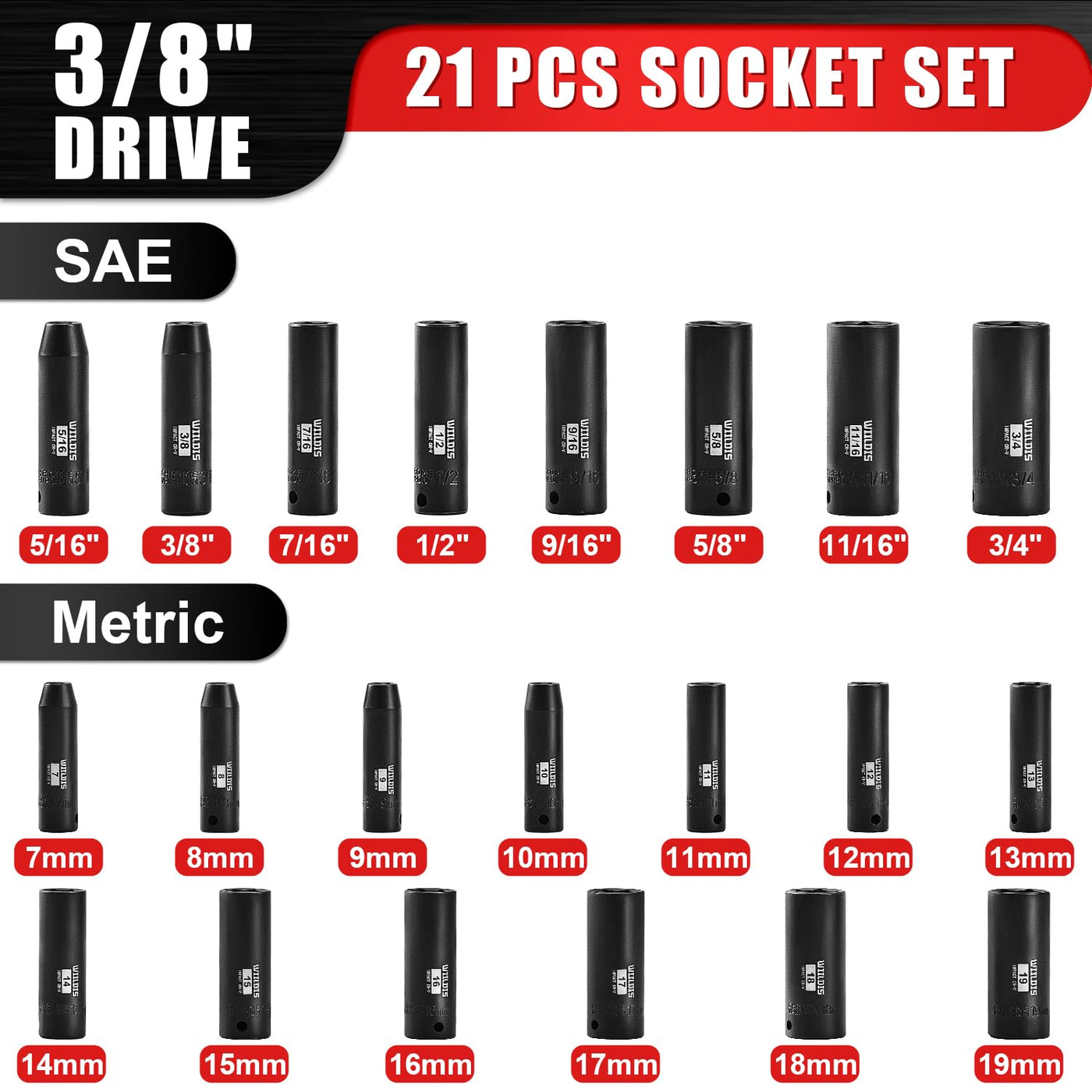 Wiildis 21 Pieces 3/8' Drive Deep Impact Socket Set, Standard Sae (5/16'To 3/4') & Metric (7Mm To 19Mm), 6 Point Design, Deep, Premium Cr-V Steel]