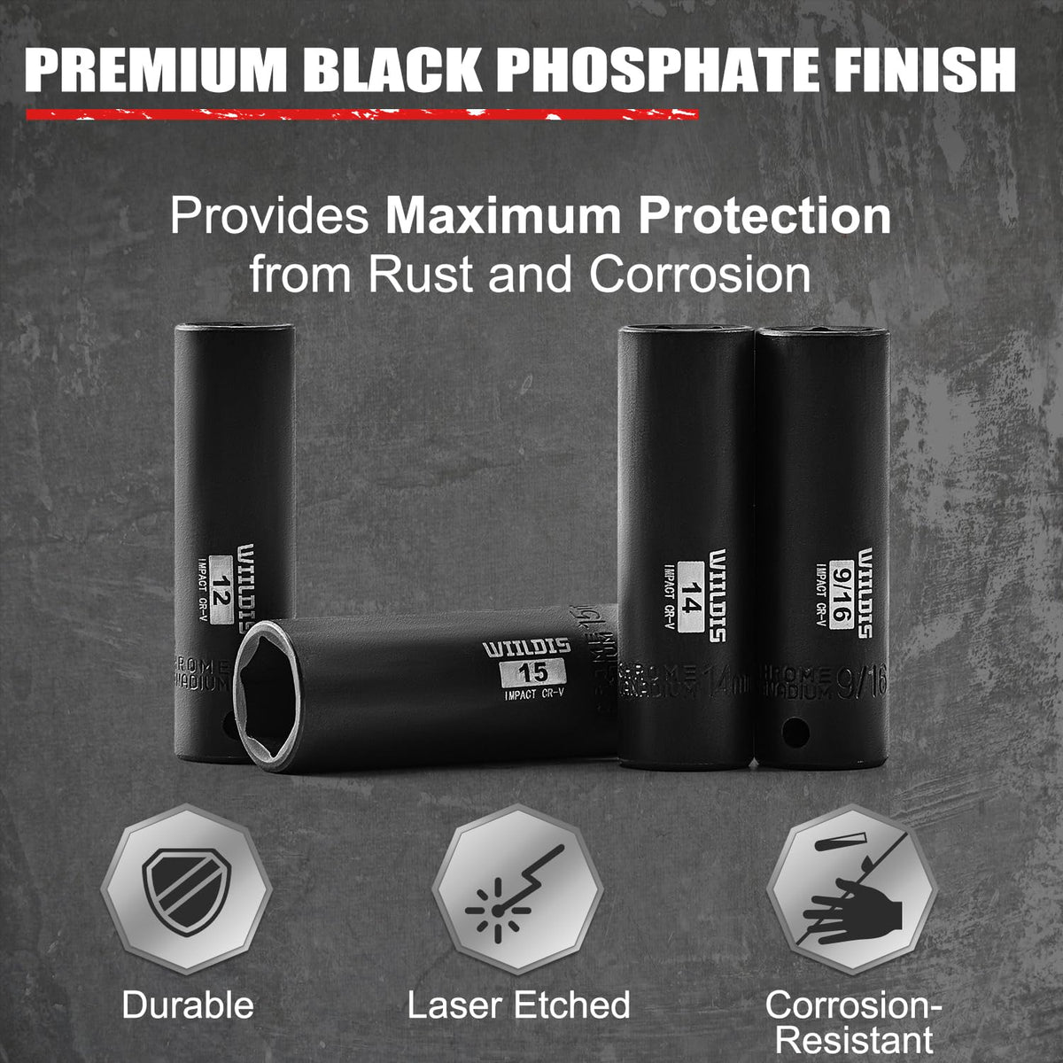 Q: What material is the WIILDIS socket set made from?A: The WIILDIS socket set is made from premium chrome vanadium steel (50BV30), which is drop forged and heat treated to provide durability and corrosion resistance.