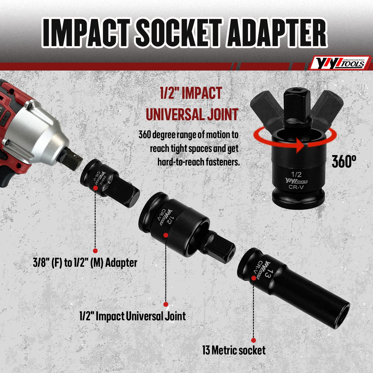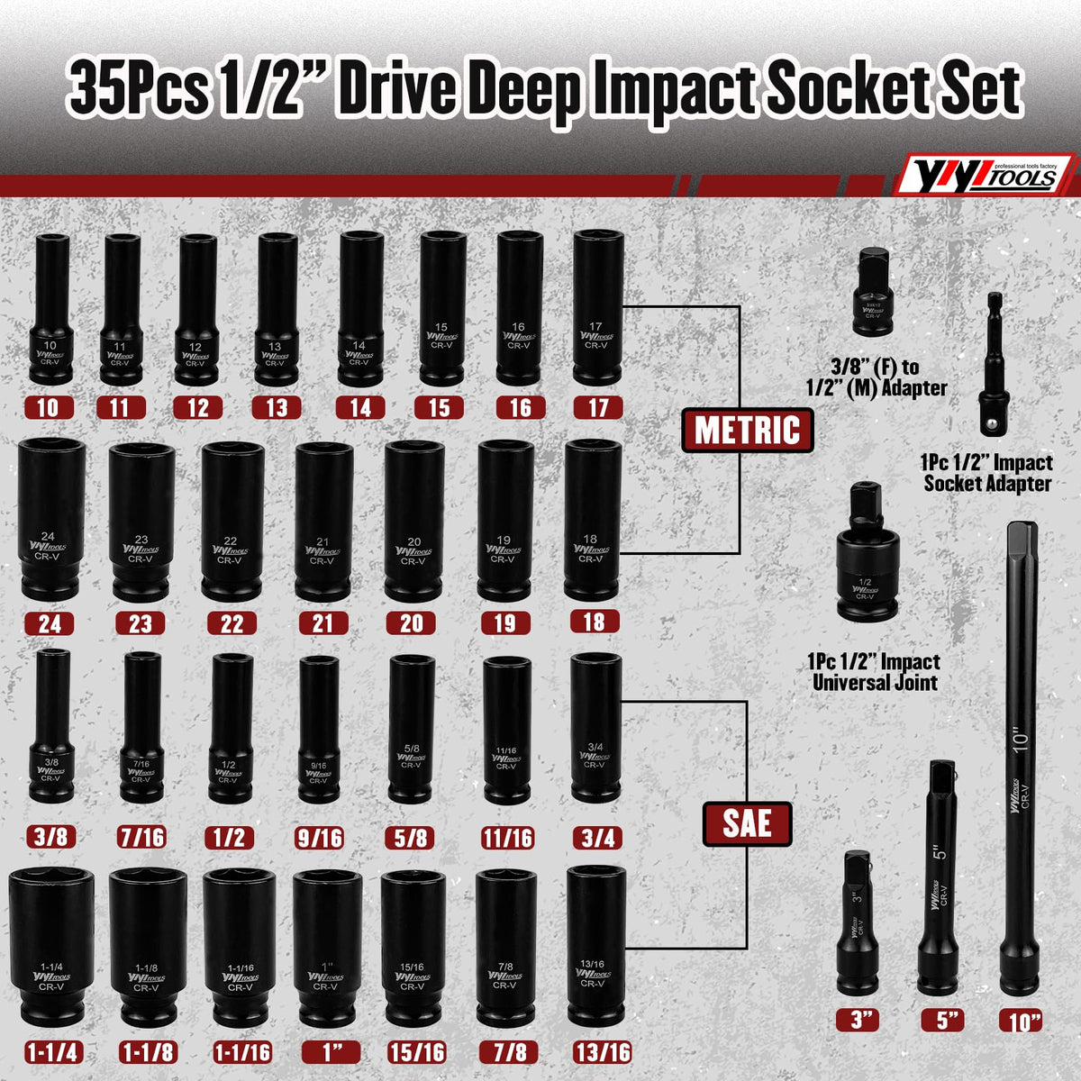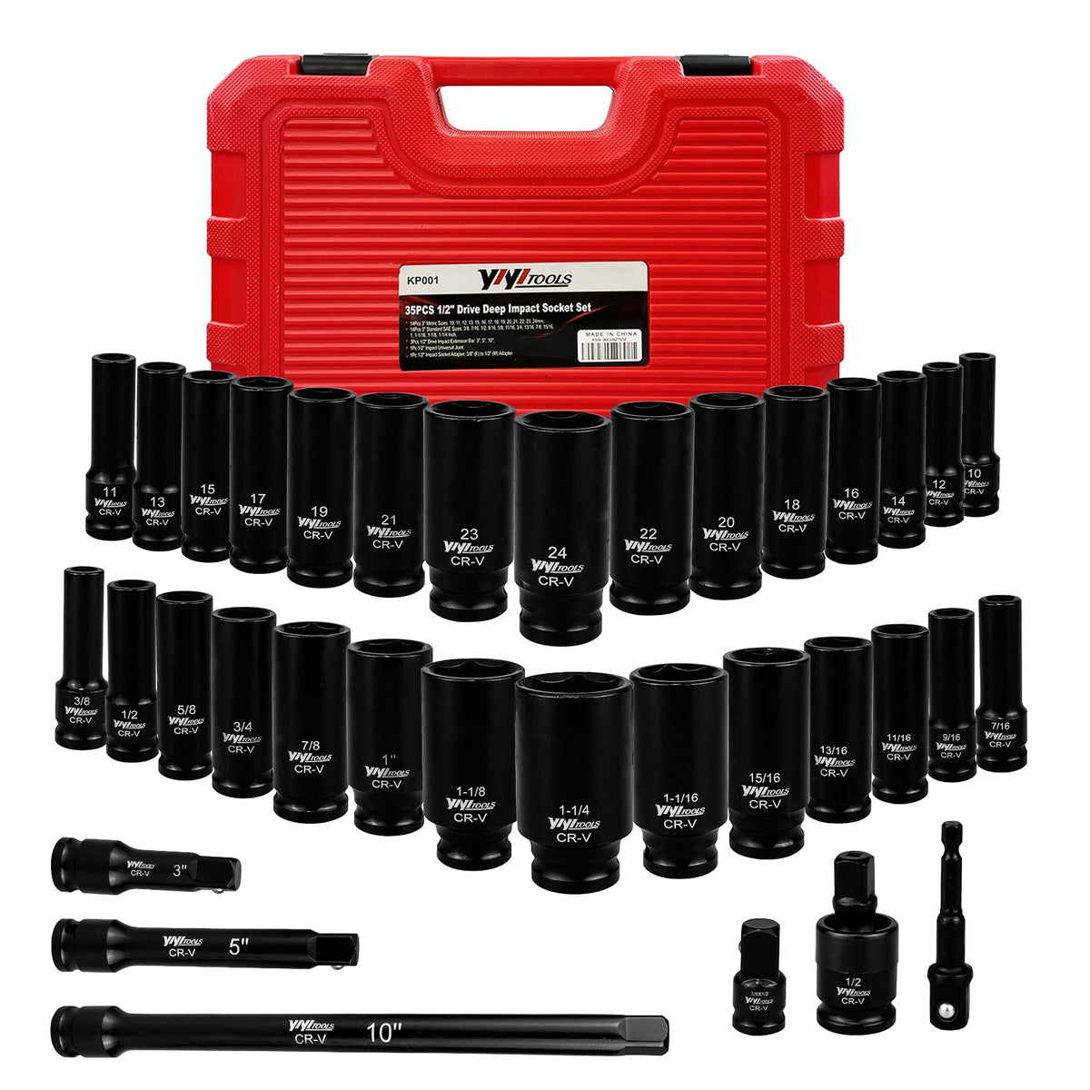 The YIYITOOLS 1/2' Drive Impact Socket Set includes 14Pcs Metric Sizes: 10, 11, 12, 13, 15, 16, 17, 18, 19, 20, 21, 22, 23, 24mm; 14Pcs Standard SAE Sizes: 3/8, 7/16, 1/2, 9/16, 5/8, 11/16, 3/4, 13/16, 7/8, 15/16, 1, 1-1/16, 1-1/8, 1-1/4 Inch; 3Pcs 1/2' Drive Impact Extension Bar: 3', 5', 10'; 1Pc 1/2' Impact Universal Joint; 1Pc 1/2' Impact Socket Adapter; 3/8' (F) to 1/2' (M) Adapter. [Versatile Applications] For a variety of jobs, such as DIY projects and auto maintenance and repairs, this 1/2-inch drive socket set is ideal. It is an essential component of every tool set. [High-Quality Chrome Vanadium Steel] The outstanding strength, durability, and corrosion resistance of the superior chrome vanadium steel (CR-V) used in the construction of the YIYITOOLS 35-piece 1/2-inch socket set provide enduring performance and dependability. [Precision 6-Point Design] This set's 6-point socket design reduces the possibility of rounding by providing a firm hold on fasteners. This gives you the confidence and ease to apply the torque. [Clear Size Markings and Convenient Storage Case] The size of each socket in this set is laser-etched, making identification quick and simple. You may conserve time and effort by finding the appropriate socket for the job quickly. The YIYITOOLS standard socket set is set up inside a durable, impact-resistant storage case. Your sockets remain accessible and organized thanks to this unique design.