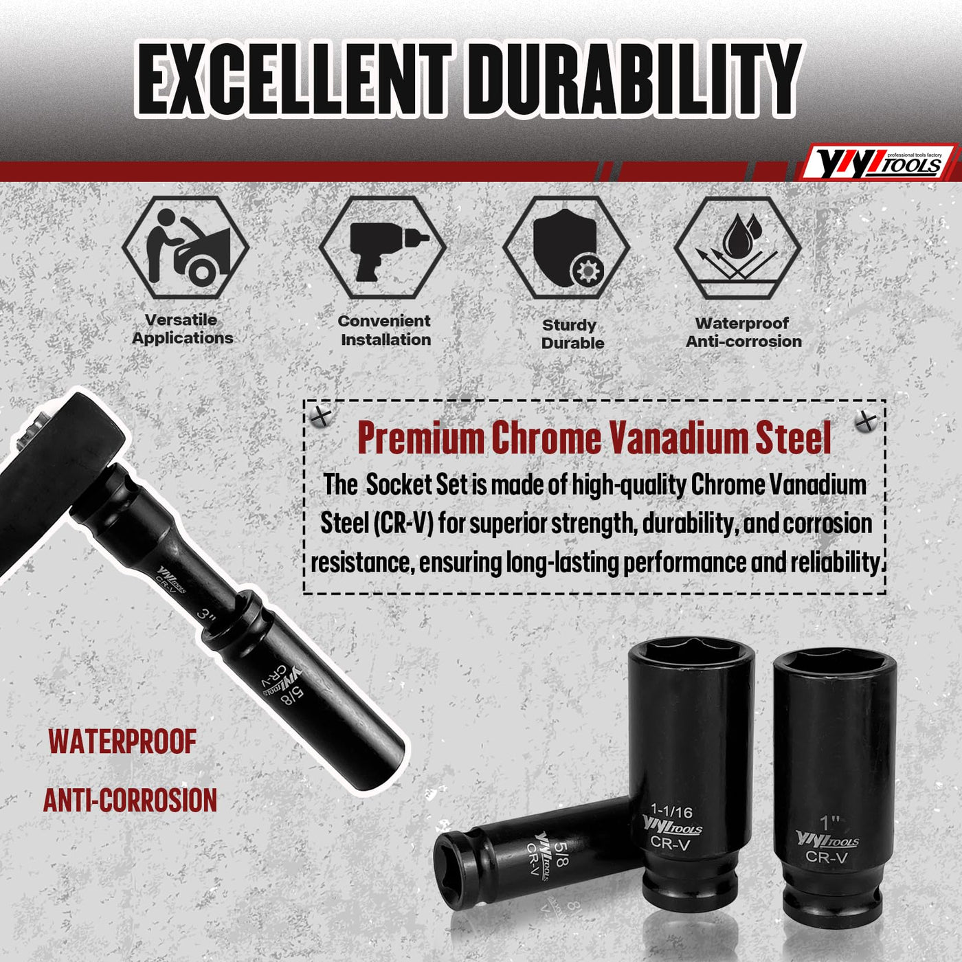 Q: What materials are used in the construction of the YIYITOOLS Impact Socket Set?A: The YIYITOOLS Impact Socket Set is made from high-quality chrome vanadium steel (CR-V), which ensures durability, strength, and resistance to corrosion for long-lasting performance.