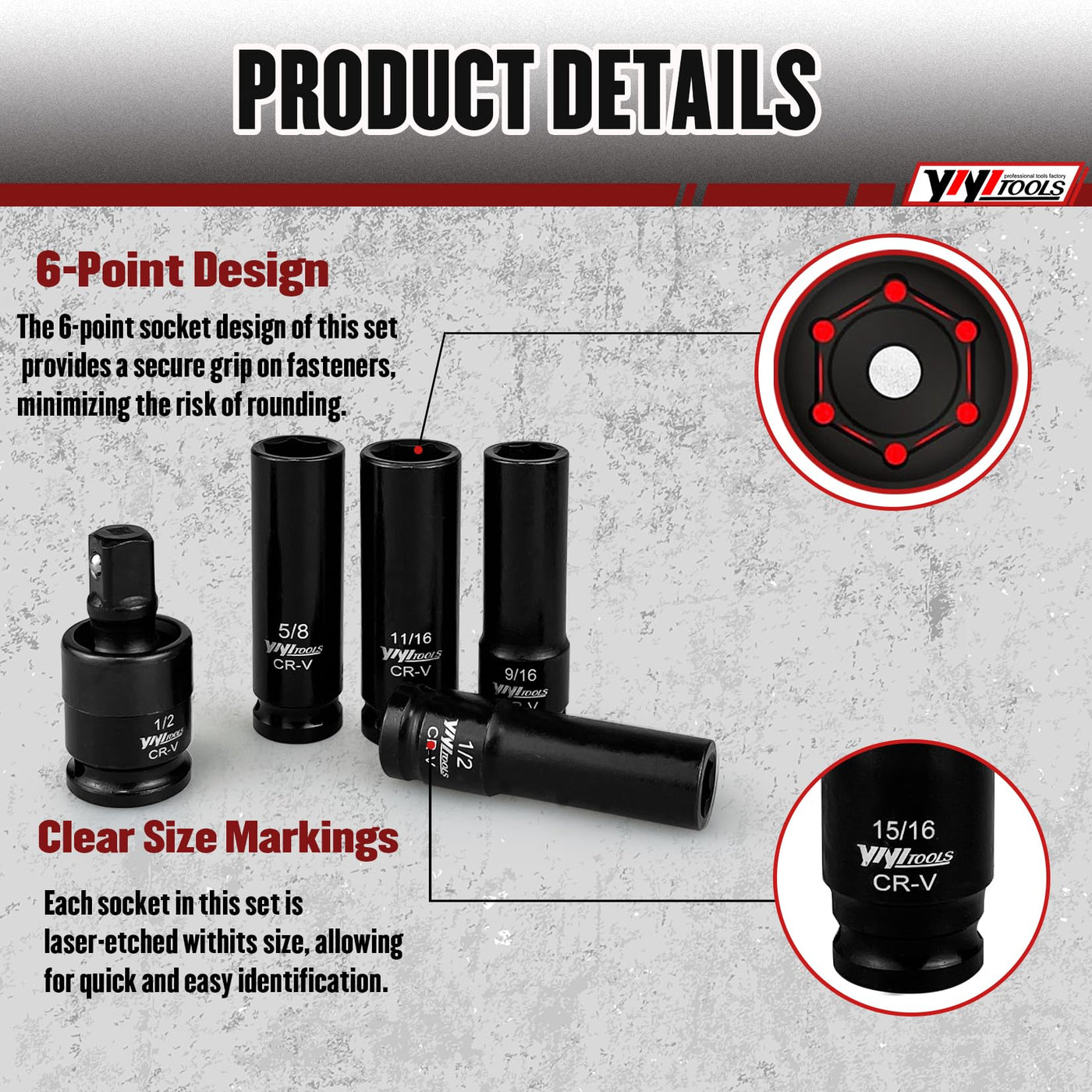 Q: Is the YIYITOOLS socket set compatible with standard ratchets?A: Yes, the YIYITOOLS socket set features a 1/2 inch drive that is compatible with most standard ratchets, making it versatile for use with different tools.