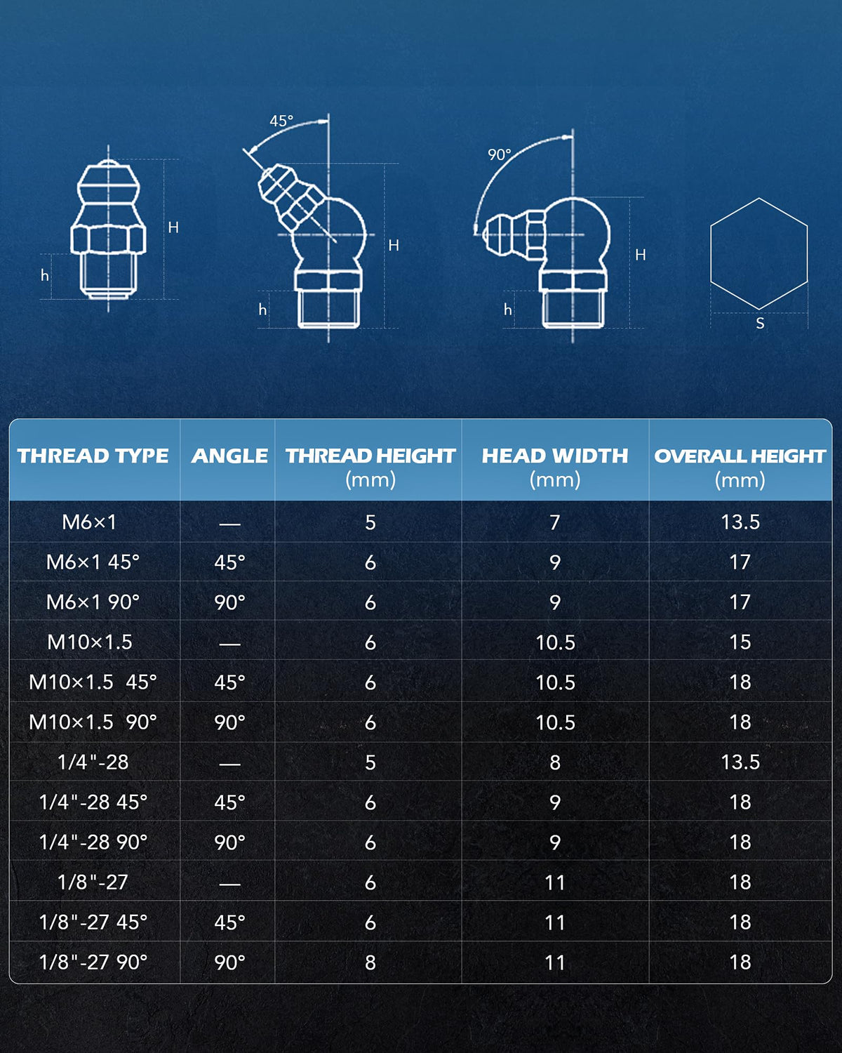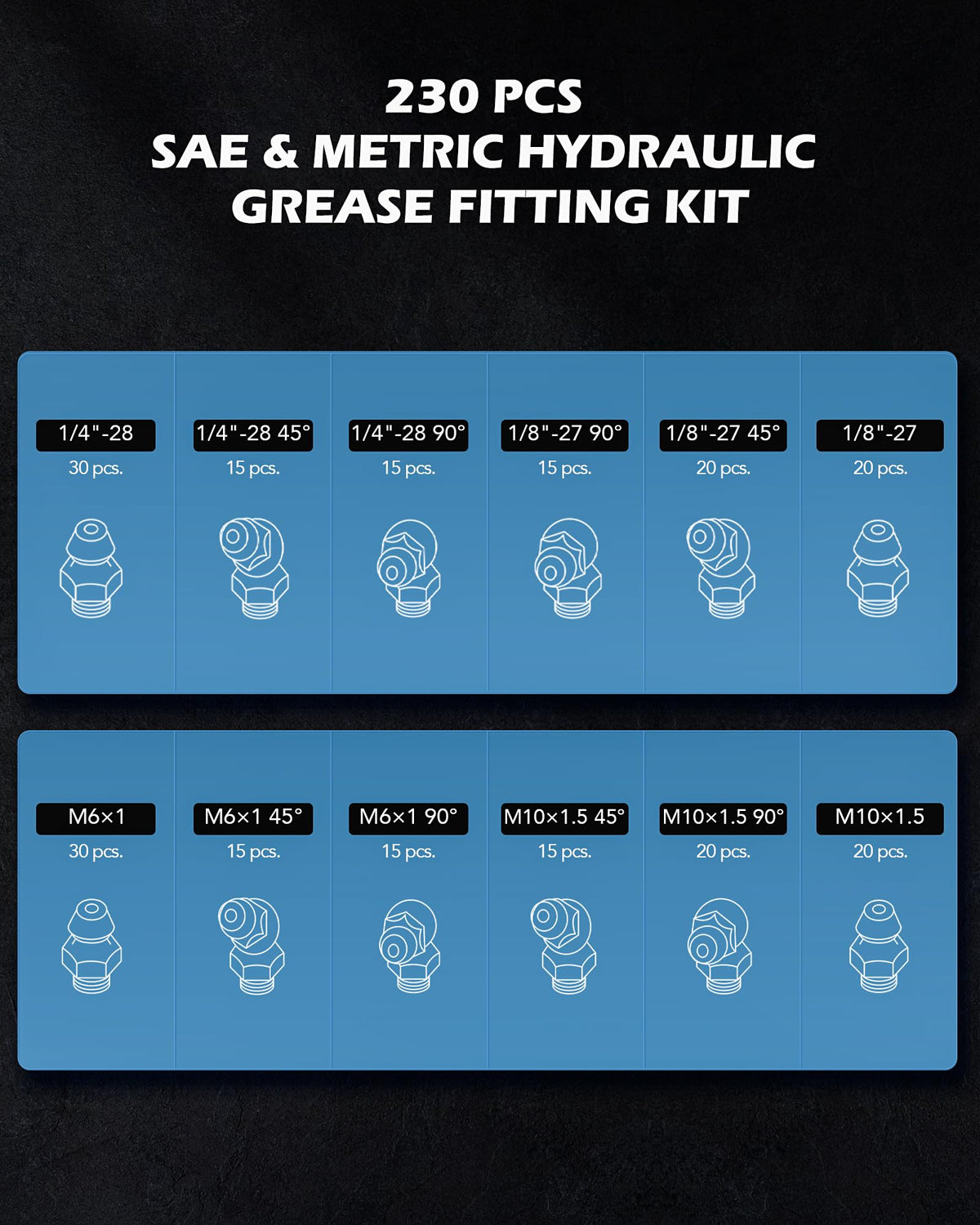 Q: Can I use these grease fittings for tight spaces?A: Yes, the kit includes straight, 45-degree, and 90-degree angled grease fittings, allowing you to inject lubricant into hard-to-reach areas without any hassle.