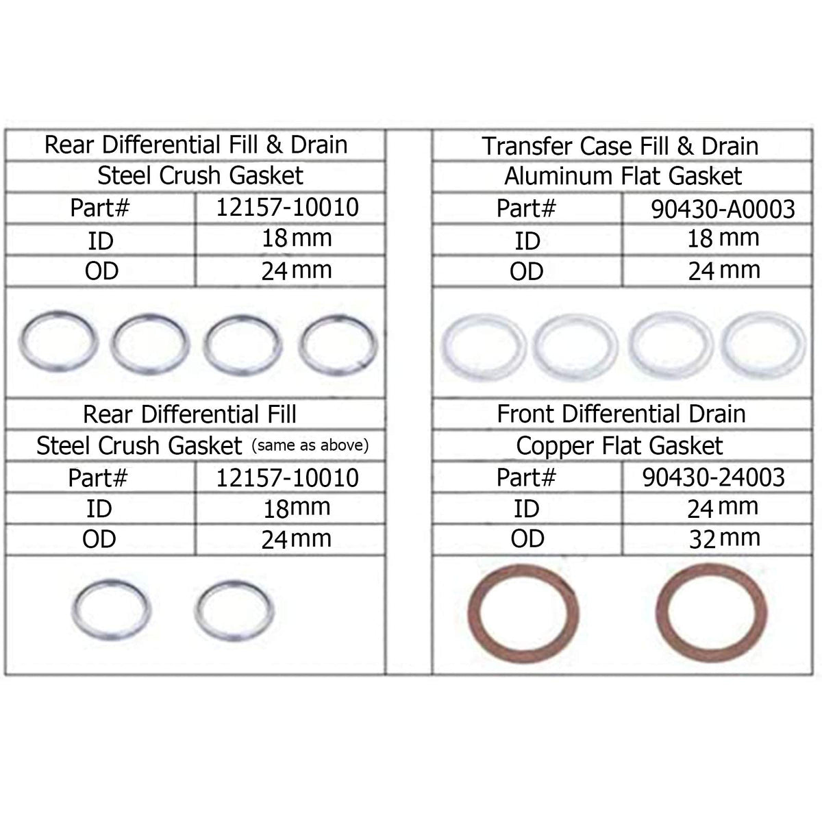 12 gaskets/washers for front, rear differential and transfer case for Toyota 4runner Tacoma Tundra FJ cruiser Land Cruiser etc. Gaskets Size 12157-10010: ID-18mm OD-24mm. 90430-18008/90430-A0003: ID-18mm OD-24mm. 90430-24003: ID-24mm OD-32mm. Package Including 6pcs replacement of the part# 12157-10010 (4 for rear diff, 2 for front dif fill) 4pcs replacement of the part# 90430-18008/90430-A0003 (4 alum washers for transfer case) 2 pcs replacement of the part# 90430-24003 (2 copper washer for front dif drain) These gaskets/washers come complete with a lifetime warranty. Hassle free to get a refund or a replacement for faulty items.