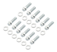 Mr. Gasket Intake Manifold Bolts have a smaller-than-standard 12-point head and incorporate extra-thick flat washers for uniform clamping pressure. Designed specifically for small-block Chevys and ideal for tight spaces, these 1.00-inch long 3/8-16 fasteners are heat-treated to Grade 8 specs, perfect for runnered race manifolds, zinc-plated for corrosion resistance, and come in a set of 12.