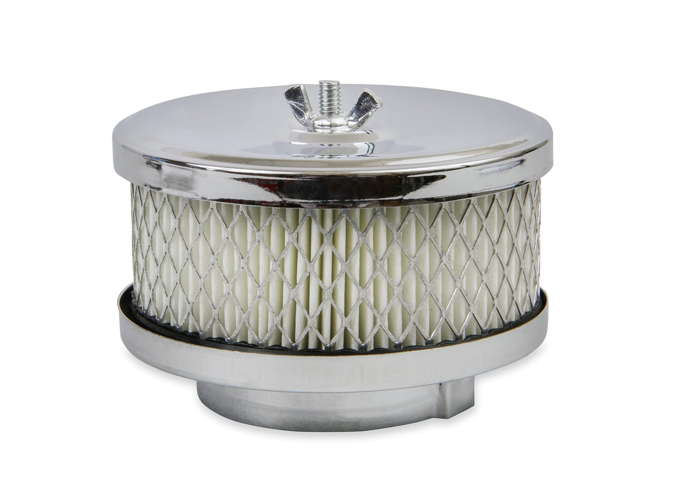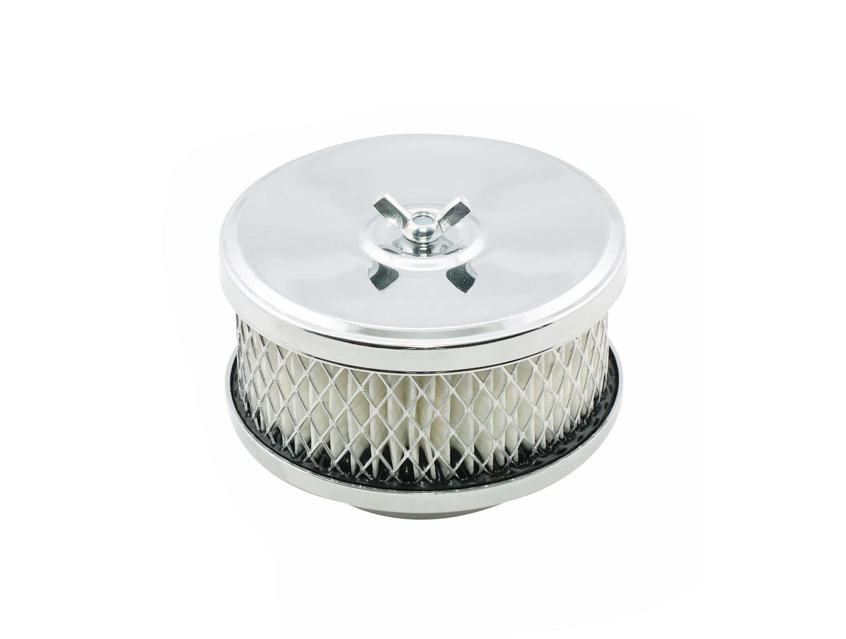 Q: What materials are used in the construction of this air cleaner?A: The Mr. Gasket 4354 features a top and base made of steel with a highly polished chrome finish, ensuring durability and a sleek appearance, while the replaceable paper element is flame-retardant for added safety.
