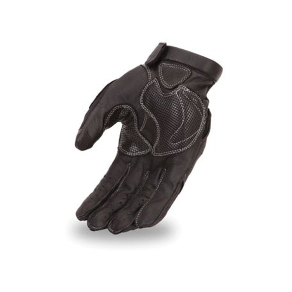 Q: What materials are used in the First Mfg Co Motorcycle Biker Riding gloves?A: The gloves are crafted from a combination of textile and aniline leather, providing enhanced air circulation and ventilation while maintaining comfort during use.