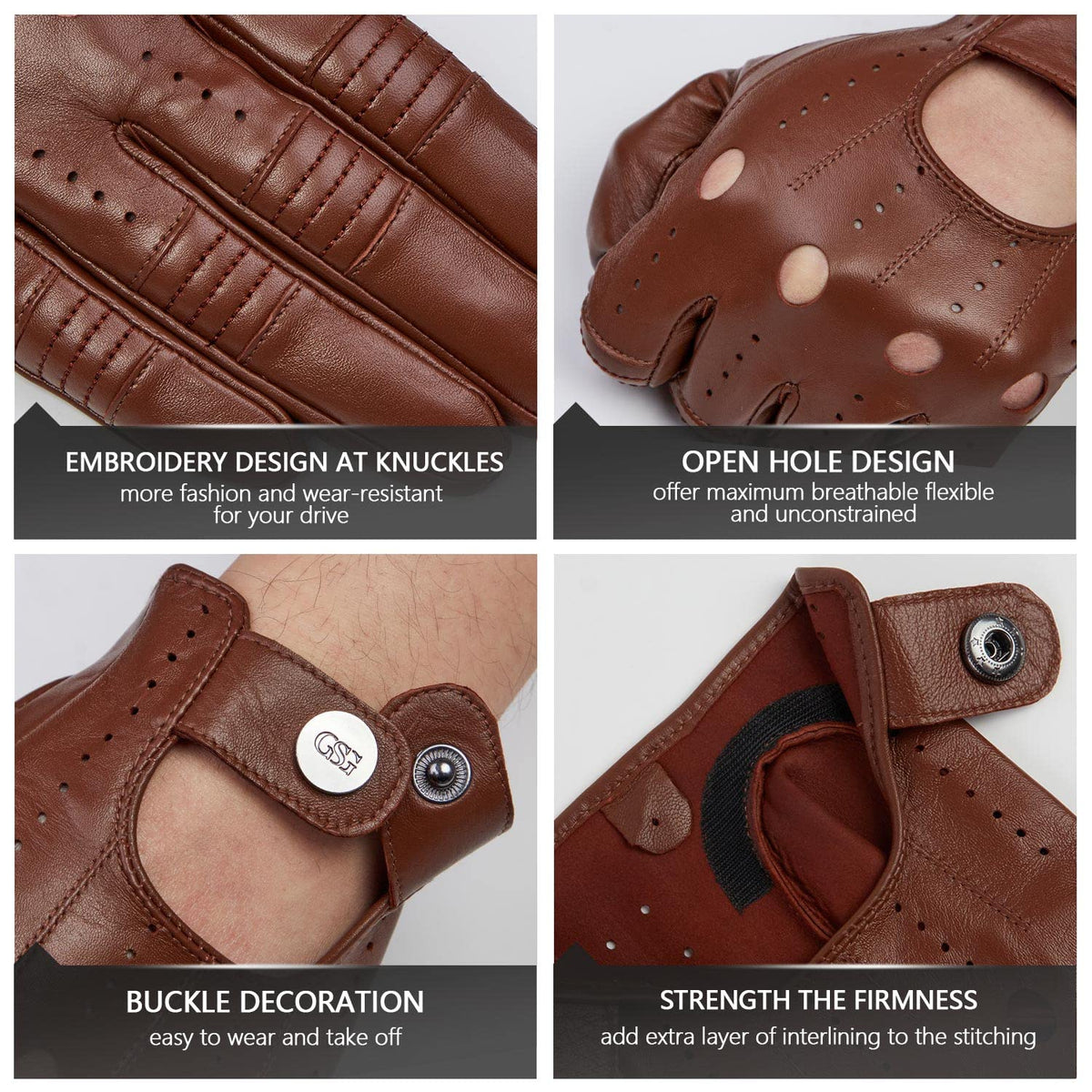 Material: Each pair of gloves is made of 100% high quality genuine leather. The leather is soft, elastic, wear-resistant and has a clear texture. | Snap closure on the back. The wrist strap with snap and elasticized wrist snugger makes it easy to get these gloves on and off. | Unlined leather gloves allow for a firm grip on the steering wheel when driving. Reverse stitched makes gloves fit comfortably. Finger vents and joint holes make the glove breathable and keep your hands dry | New breathable design really adds style to men driving gloves great for riding, cycling, motorcycling, sports. | Maximum breathability:knuckle&palm hole and vent.Give you a more effortless and comfortable grip that allows you to power through the extra miles while driving.