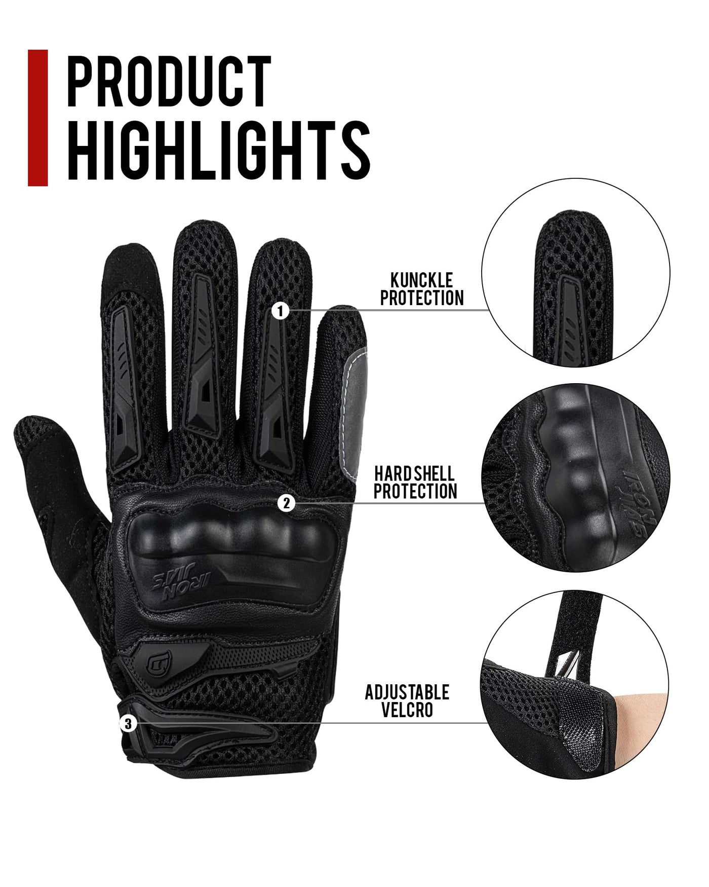 Q: How do these gloves provide protection while riding?A: IRON JIA'S Motorcycle Gloves offer outstanding protection with hard shell coverage for knuckles and fingers, effectively reducing the impact of collisions. Additionally, they feature TRP padding in the palms for added support.
