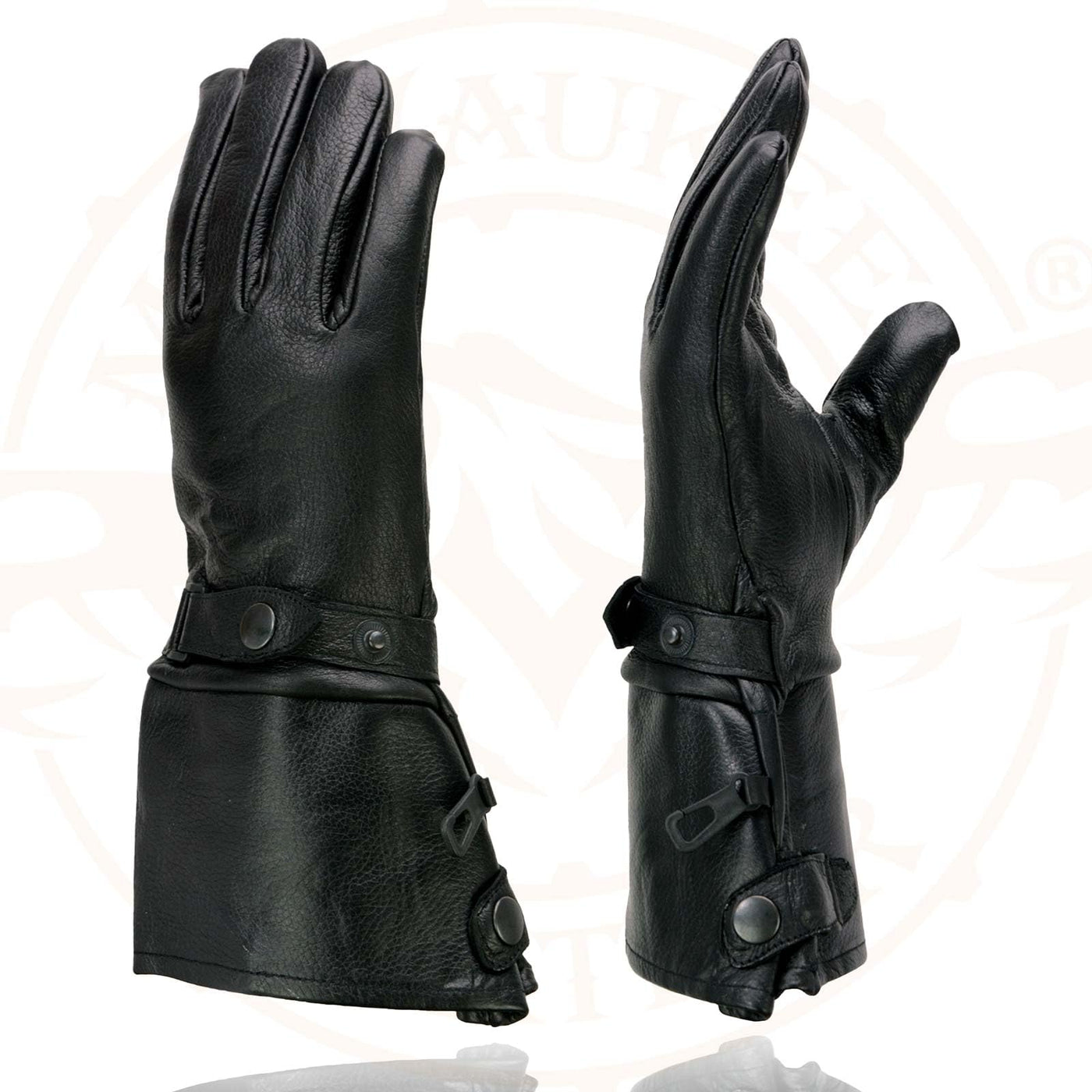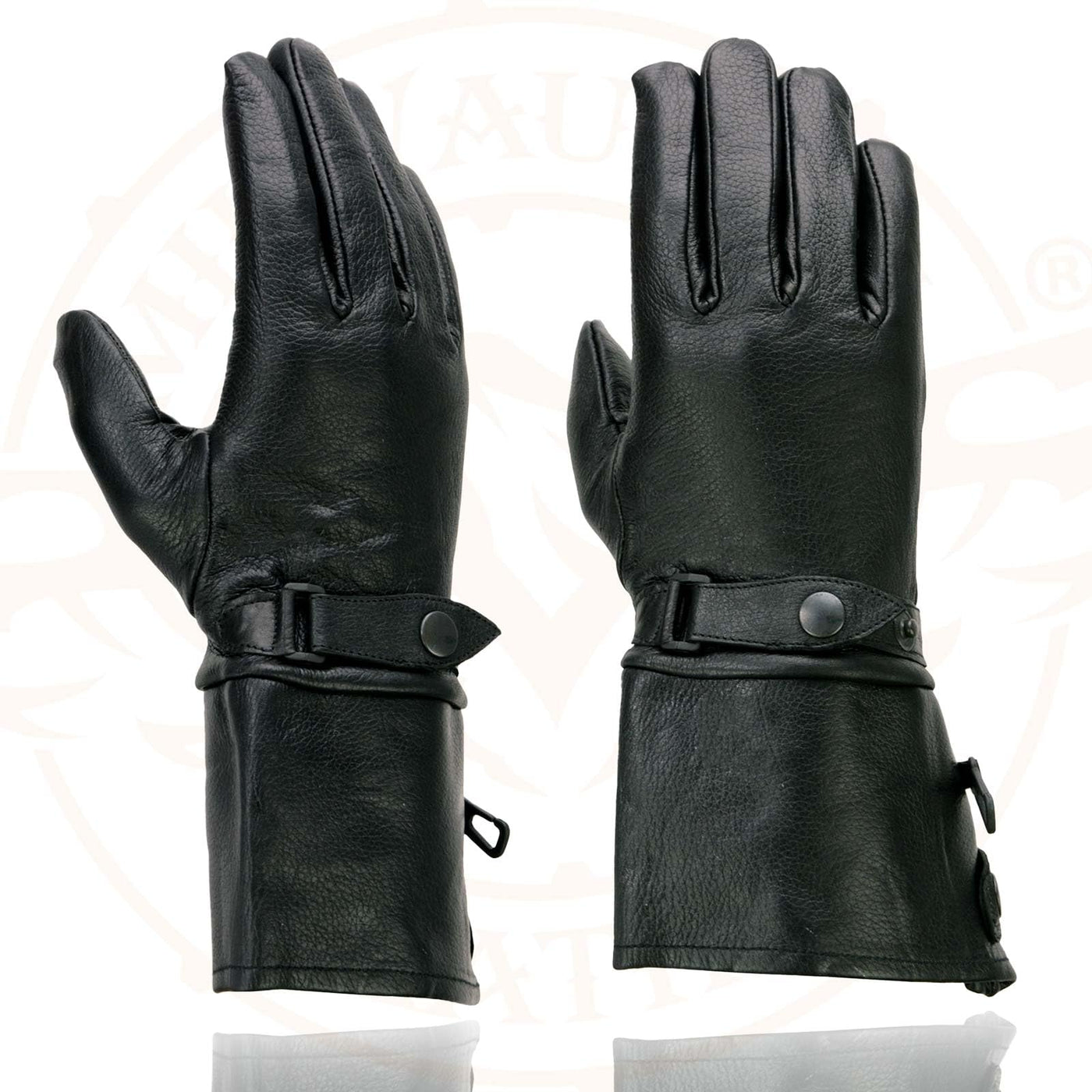 DescriptionMilwaukee Leather Men's Gauntlet Motorcycle Hand Gloves-Black Leather Long Cuff Snap Closure Thermal Lined-SH264Features Premium Cowhide Leather Riding Gloves | Our specially crafted full-grain black cowhide leather riding gloves offer windproof protection for your hands and fingers. Made from impermeable cow skin, these gloves provide a perfect blend of style and comfort. With their thicker and stronger construction, they are built to withstand tough riding conditions while delivering long-lasting performance. Cowhide leather will continue to soften over time and with use, it retains its durability. Thermal Lined Motorcycle Gloves | These men's motorcycle gloves feature a high-quality thermal-lined fabric interior, ensuring heat retention and providing a weather-resistant riding experience. The long cuff design adds an extra level of insulation, offering a warmer feeling while riding street or dirt bike. Rider gloves provide exceptional warmth and a spacious feel while riding. Biker Gloves | These high cuff gauntlet full-finger biker winter gloves are crafted classic style with single layer leather palm and knuckles for sophisticated look. This design offers both comfort and protection against abrasion, ensuring long-lasting performance. Adjustable Rider Gloves | These gauntlet leather rider gloves are equipped with adjustable strap on the back of the hand and edge of the long cuff with snap closure system, designed to excel in harsh and frigid weather conditions, featuring a long cuff, which makes them an ideal choice for fall, winter, and spring riding. Motorcycle Leather Apparel | Experience the quality and craftsmanship of Milwaukee leather