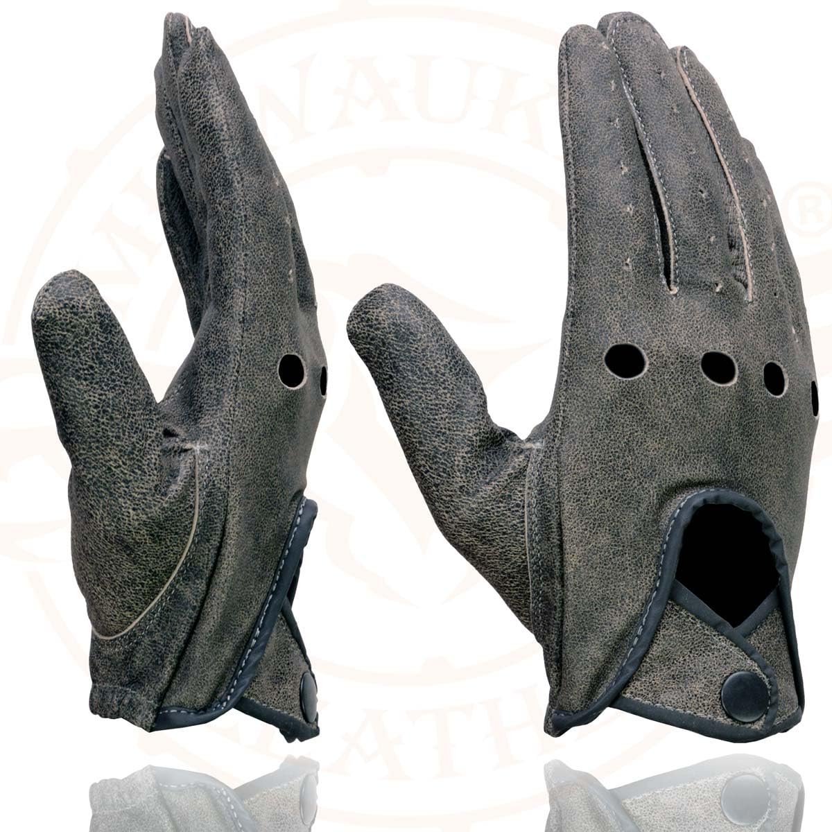 DescriptionMilwaukee Leather MG7507 Mens Distressed Grey Leather Driving Gloves with Wrist Snap Made of Premium Cowhide Jumble Leather Unlined Open Knuckle with Perforated Finger Panel Wrist Strap Closure