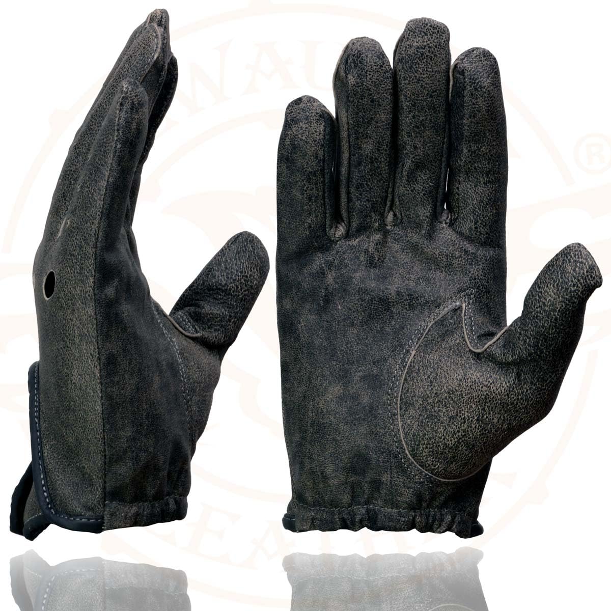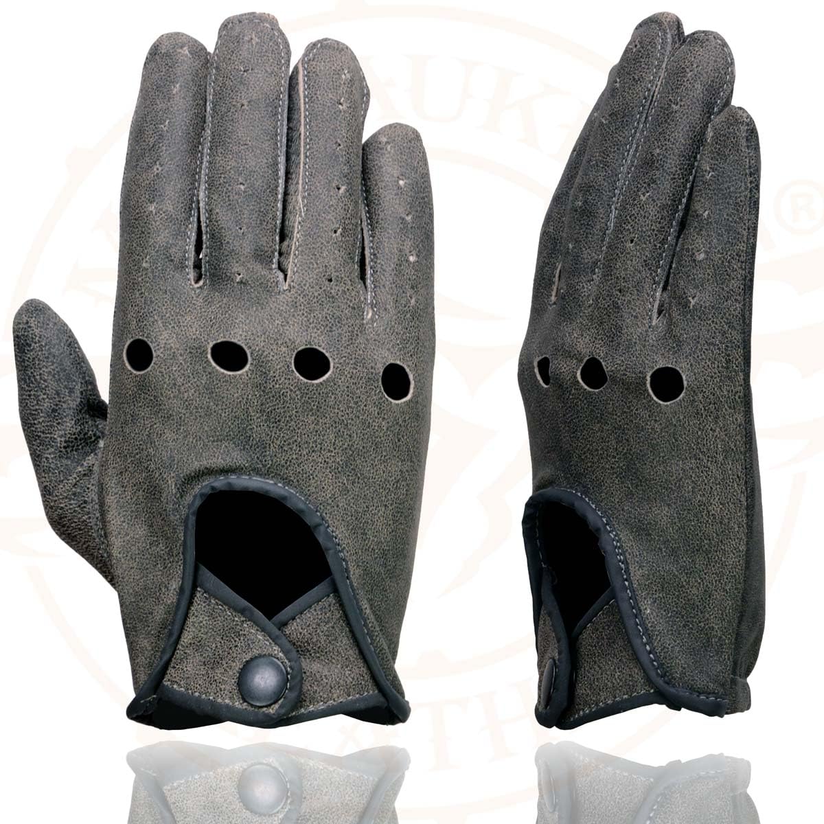 DescriptionMilwaukee Leather MG7507 Mens Distressed Grey Leather Driving Gloves with Wrist Snap Made of Premium Cowhide Jumble Leather Unlined Open Knuckle with Perforated Finger Panel Wrist Strap Closure