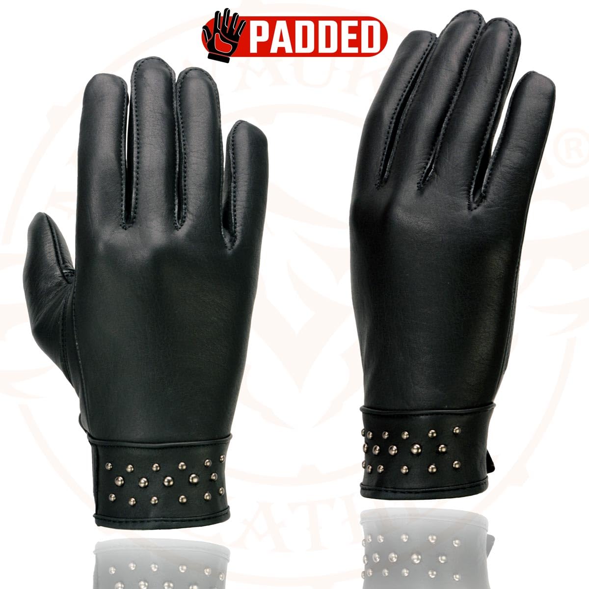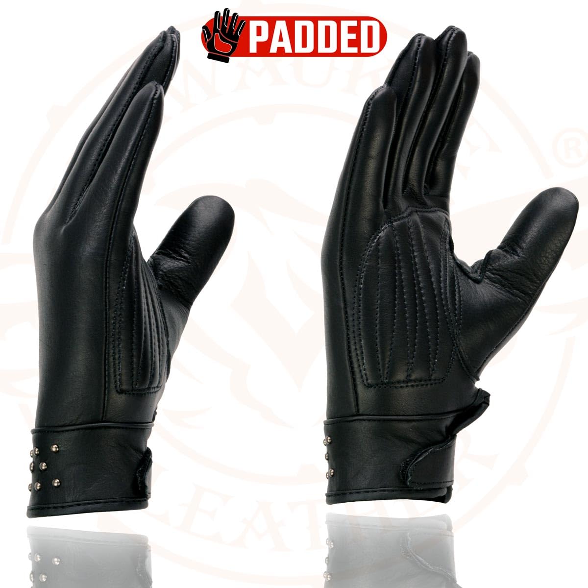 DescriptionMilwaukee Leather MG7760 Women's Black Leather Gloves with Gel Palms Made of Premium Cowhide Jumble Leather Rivet Detailing Outlining Wrist Light Liner with Gel Palm Adjustable Wrist Strap