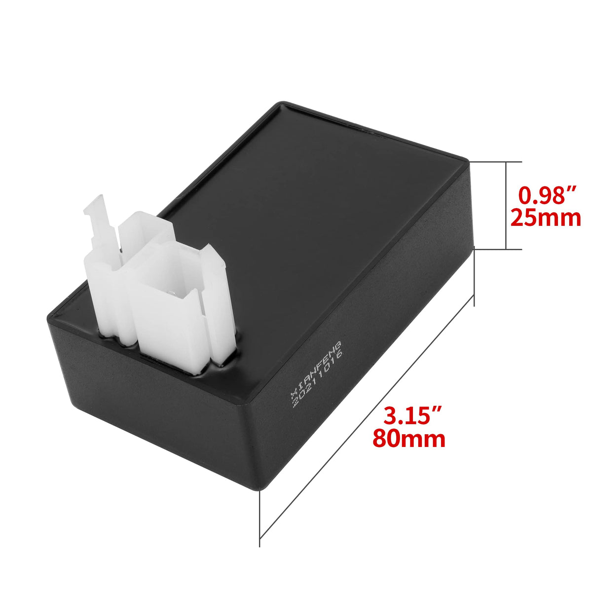 Q: What are the dimensions of the 6 Pin DC CDI Box?A: The 6 Pin DC CDI Box has a length of 3.15 inches (80mm) and a height of 0.98 inches (25mm), featuring a male plug design.