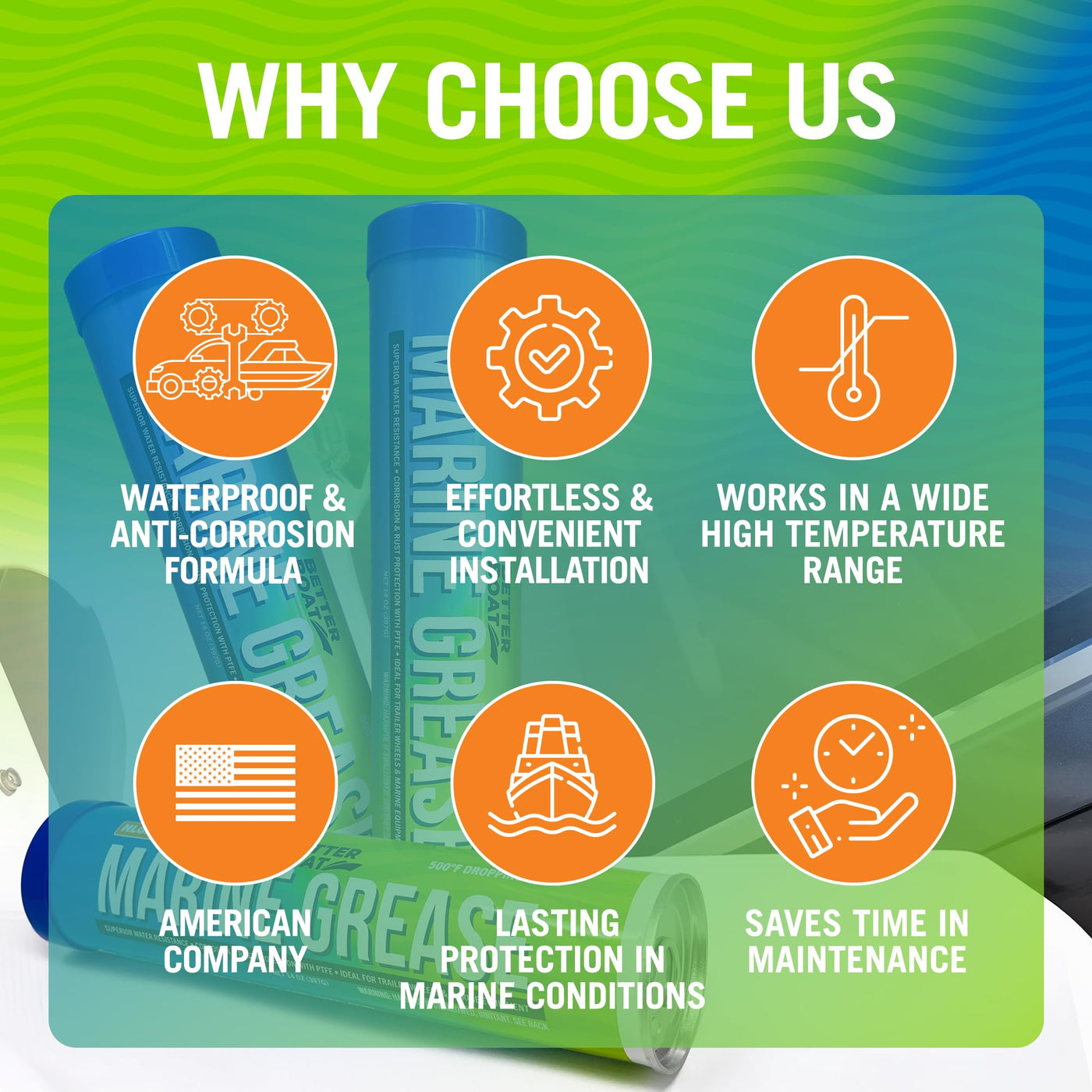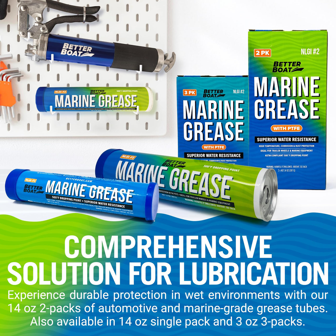Discover the versatility and superior performance of our Universal Application Grease Tube, available in both 14oz and 3oz sizes. This all-purpose, high-temp marine bearing grease cartridge is ideal for protecting trailers, wheel bearings, hitch balls, and marine machinery. Rated NLGI 2 Grease GC-LB and meeting ASTM D4950 requirements, our blue grease ensures your equipment is protected by industry-leading standards. Designed to perform across a wide temperature range, it offers year-round protection from freezing to extreme heats, making it perfect for use on your boat trailer, bike, ATV, or other trailers. Our grease is engineered for unmatched durability, featuring a waterproof formula that prevents washout and corrosion in wet conditions, ensuring lasting protection for automotive and marine applications. As a family-owned American business, Better Boat is committed to providing premium boating accessories and stands behind the satisfaction of our NLGI 2 grease cartridges for grease gun solutions. Our grease cartridges are far easier to use than a marine grease tub and they are compatible with both 3oz and 14oz grease guns, including standardized versions you may already have, ensuring easy application. Whether you need wheel bearing grease packers, ball joint grease, tube grease, boat trailer wheel bearing grease, or bike axle grease, our product offers a comprehensive solution. Our high-temp grease tubes, including waterproof marine grease, are essential for maintaining vehicle components and protecting against corrosion and wear in marine environments. Choose Better Boat for reliable, high-quality lubrication products for a wide range of applications.