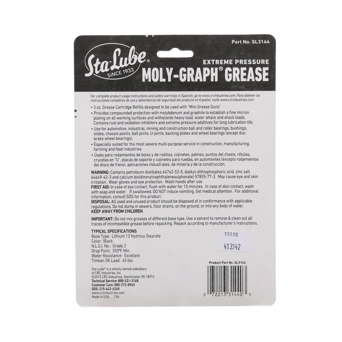 Q: What is the Timken load rating for this grease, and why is it important?A: The Timken load rating for Sta-Lube Moly-Graph Extreme Pressure Grease is 45 lbs. This rating indicates the grease's ability to withstand heavy loads without breaking down, making it essential for applications subjected to high pressures.