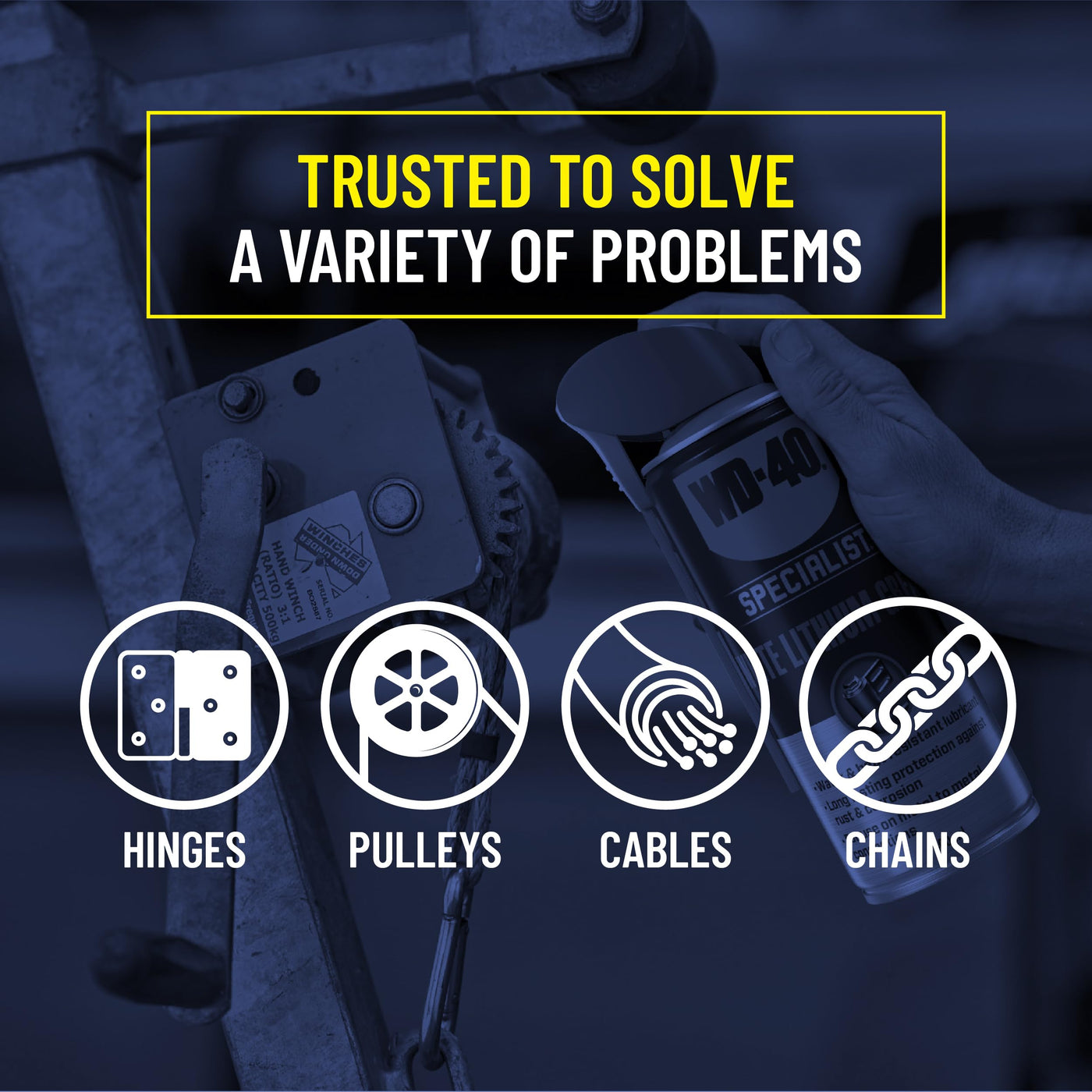 An Aerosol Grease That Sprays On Evenly As A Liquid And Sets Dry For A Thick Protective Coating That Won'T Run Off. Wd-40 Specialist White Lithium Grease Is Ideal For Metal-To-Metal Applications That Require Heavy-Duty Lubrication And Leaves Behind A Rust-Inhibiting Barrier For Protection Against Corrosion. This Long-Lasting Formula Won'T Melt, Freeze, Or Run In Harsh Weather Conditions. Also Great For Lubricating Equipment Before Placing In Storage. Sprays On Easily With A Thick, Protective Coating For Outdoor And Automotive Hinges, Gears, Sprockets, Latches, Door Tracks, Pulleys, Cables And Guide Rails. Safe To Use On Metals. Effective In Temperatures Ranging From 0 F To 300 F For Unbeatable Protection. - Long-Lasting Lubrication And Protection - Lubricates 8X Longer Than The Competition For Less Frequent Reapplication* - Withstands 1.5X More Pressure Than The Competition For Less Frequent Reapplications And Reduced Downtime** - 50-State Voc Compliant - Nsf Category H2 (#146864) *Test Lab: Petro-Lubricant Laboratories Inc. (Lafayette, Nj); Astm D5620A; Test Date: 04/2020 **Test Lab: Wd-40 Co. Technical Center (Pine Brook, Nj); Astm D3233A; Test Date: 12/2020