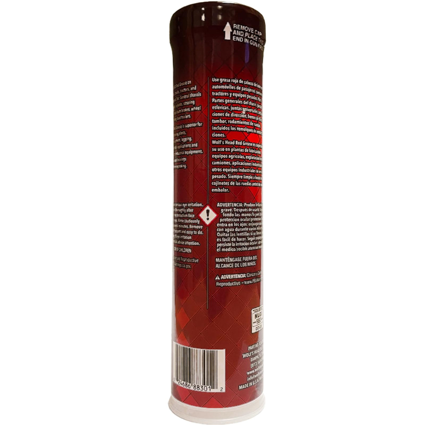 Wolfs Head Red Grease is a premium, multipurpose automotive/truck chassis and bearing lithium complex grease. Applicable in a variety of automotive and industrial uses requiring extreme pressure protection, oxidation, inhibition, water resistance, and anti-rust properties, including disc brakes, wheel bearings, chassis, ball-joints, 5th wheels and others. It possesses excellent water-resistant properties, corrosion resistant and rust preventative properties. This grease is designed to stay-in-place and lubricate under the most severe operating conditions found in industrial and automotive service. Wolfs Head Red Grease offers outstanding extreme pressure and anti-weld protection making it ideal choice for off- high-way heavy and construction equipment. Qualified under the NLGI GC-LB classification, Wolfs Head Red Grease is recommended for use in high-temperature, humidity, and water contamination applications such as mining, marine, and construction. This grease is capable of operations from minus 10 degrees F to 375 degrees F, but with a dropping point of more than 500 F.