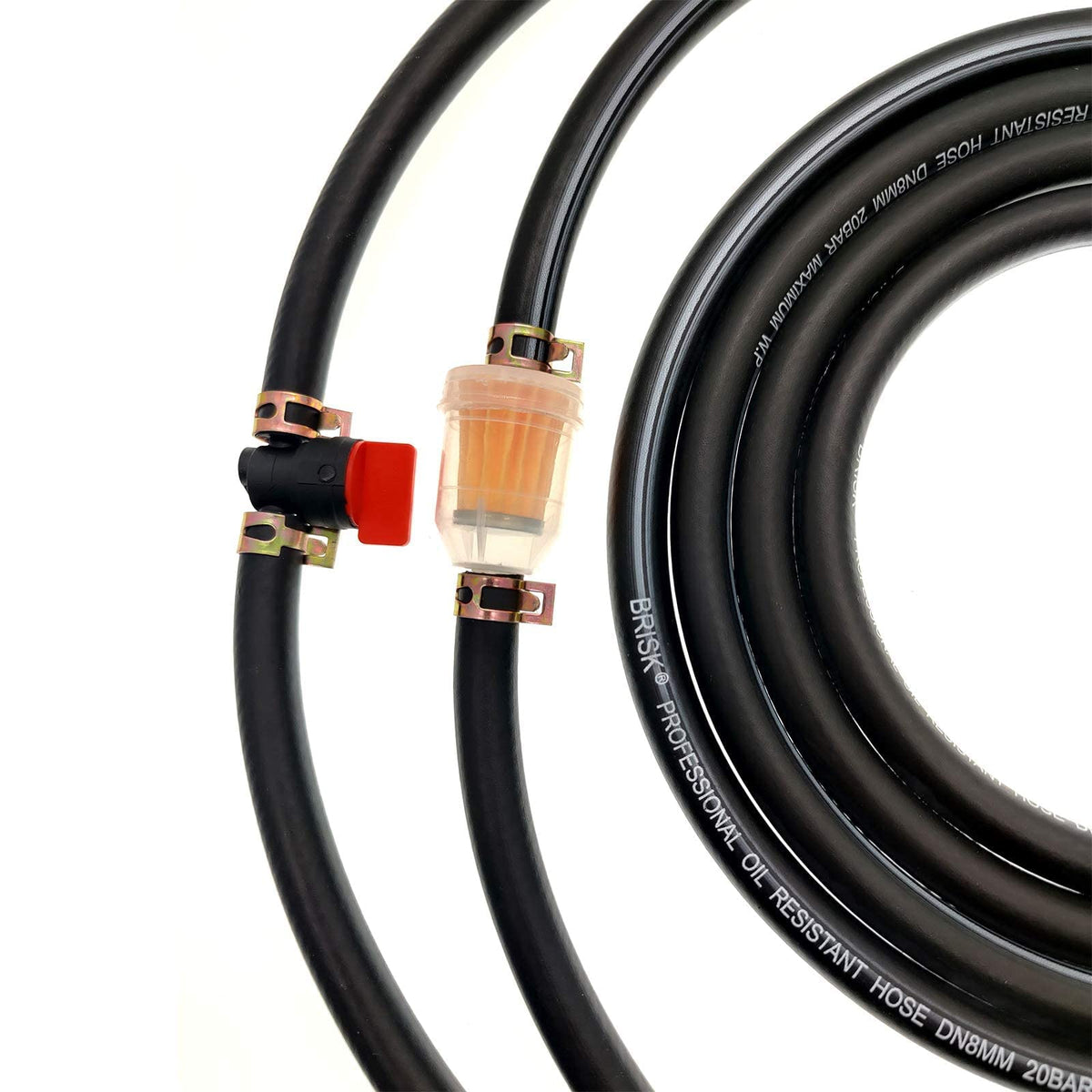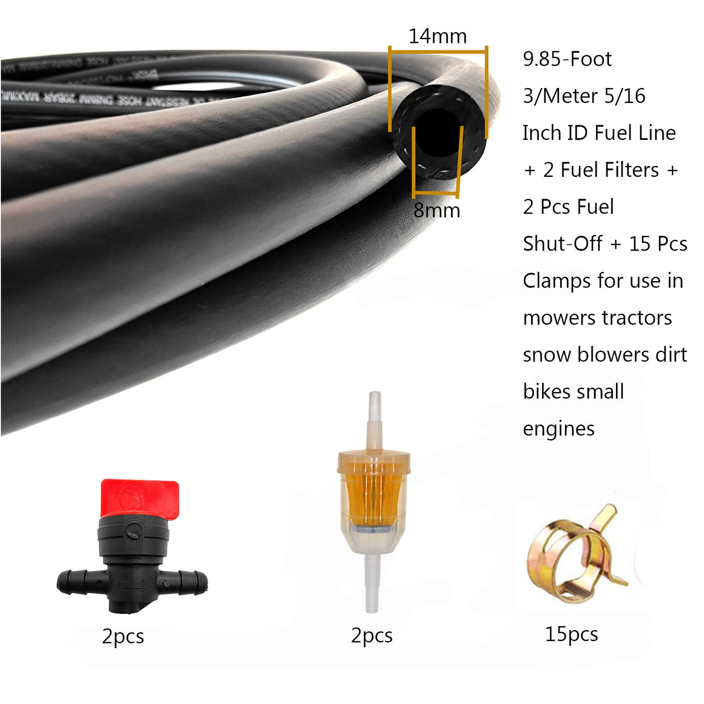 ?Kit combination?9.85-Foot 3/Meter 5/16 Inch ID Fuel Line + 2 Fuel Filters + 2 Pcs Fuel Shut-Off + 15 Pcs Clamps for use in mowers tractors snow blowers dirt bikes small engines ?3-layer thickened fuel line?The fuel line is divided into 3-layers: inner pipe, outer pipe and intermediate reinforcing layer. The inner and the outer pipe are made of rubber and the middle reinforcing layer is a woven fiber nylon thread. rubber hose resistant to diesel oil, gasoline, aging, cold and low temperature ?Fuel Filter With a Magnet?Filter the impurities, dirt, particles in fuel, prevent blockage of carburetor, only allows clean fuel flows in and keep engines at full power. ?Hose Clamps?65 manganese steel clamp, durable and can be reused. Tight clamping force prevents liquid leakage. ?Fuel shut off valve? Top Quality 1/4'' Fuel shut off valve for many mowers/Generators/Garden machines.It helps with fuel leaks due to a bad needle valve or leaking carburetor. 9.85-Foot 5/16 Inch ID Fuel Line Set Size:8mm Fuel Line - Material: synthetic rubber tube - Inner diameter: 8mm - Outer diameter: 14mm - Adapt to temperature: -30 C -110 C - Hose density: 1.35g/cm - Working pressure: 2MPa/300Psi - Burst pressure: 6MPa/1000Psi Package included: - 1 x 5/16 Inch 9.85 Foot Fuel Line - 2 x Tubing filter - 15 x Hose Clamps -2 x 1/4 Fuel Shut-Off Valve Scope of application: Can be used on many small tractors, lawn mowers, snowmobiles, garden tillers, go karts, generators with 1/4'' or 5/16'' fuel lines Fit for all Outdoor Power Equipment, small non fuel injected cars and motorcycles or small Engine