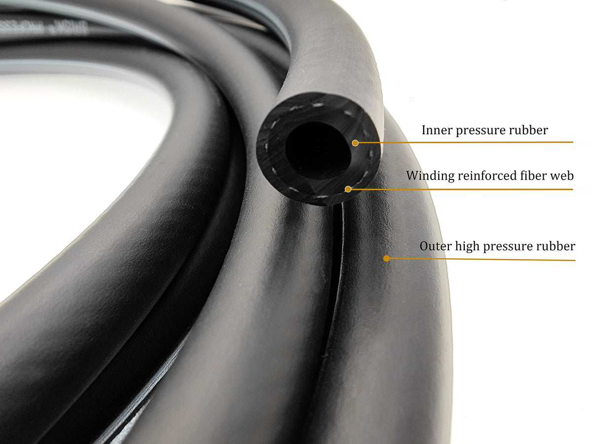 Q: What materials are used in the fuel line, and how durable is it?A: The fuel line is made from synthetic rubber and features a 3-layer construction, including an inner pipe, outer pipe, and a woven fiber nylon thread reinforcing layer. This design ensures it is resistant to diesel oil, gasoline, aging, and extreme temperatures ranging from -30 °C to 110 °C, providing excellent durability for outdoor use.