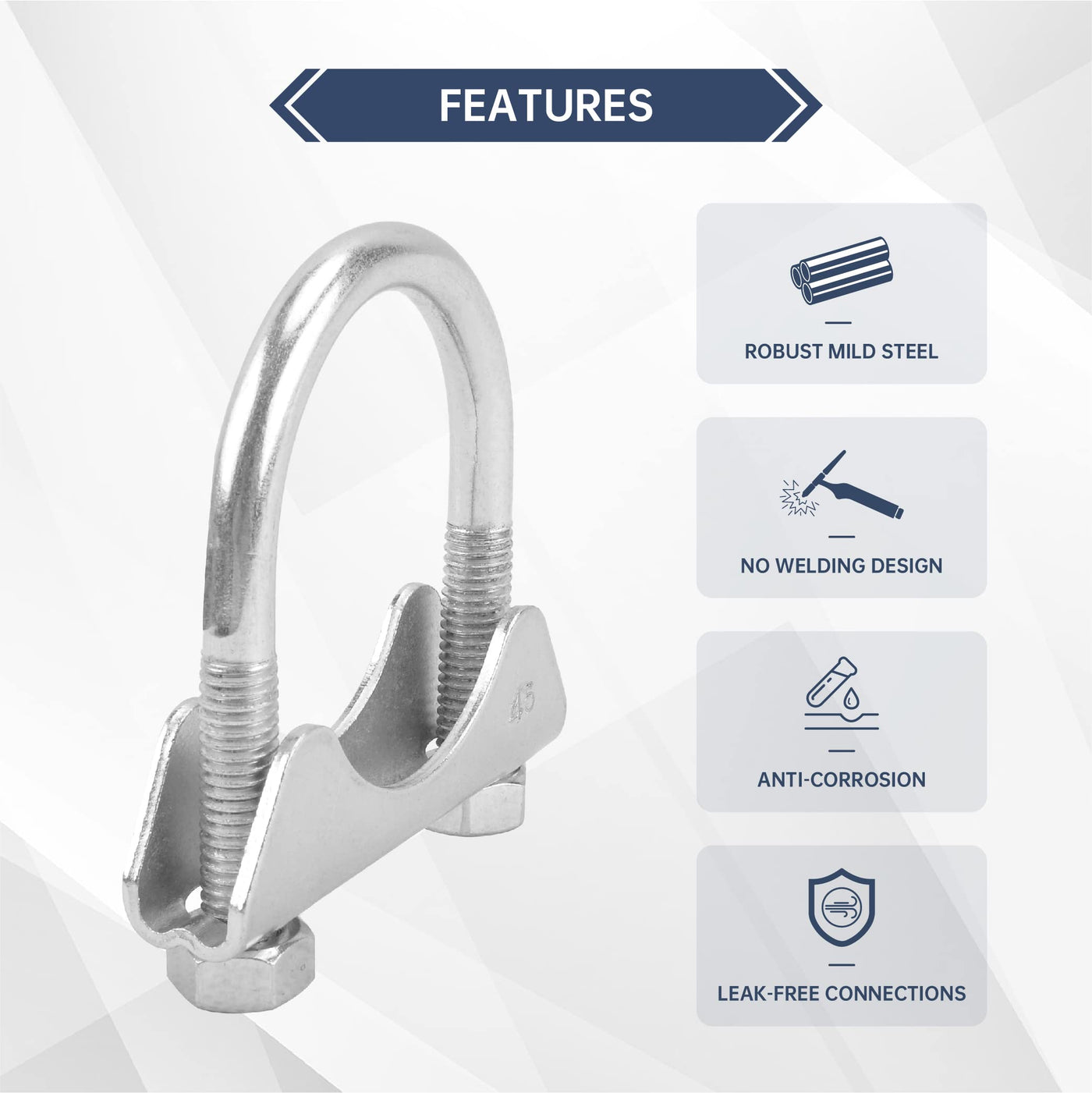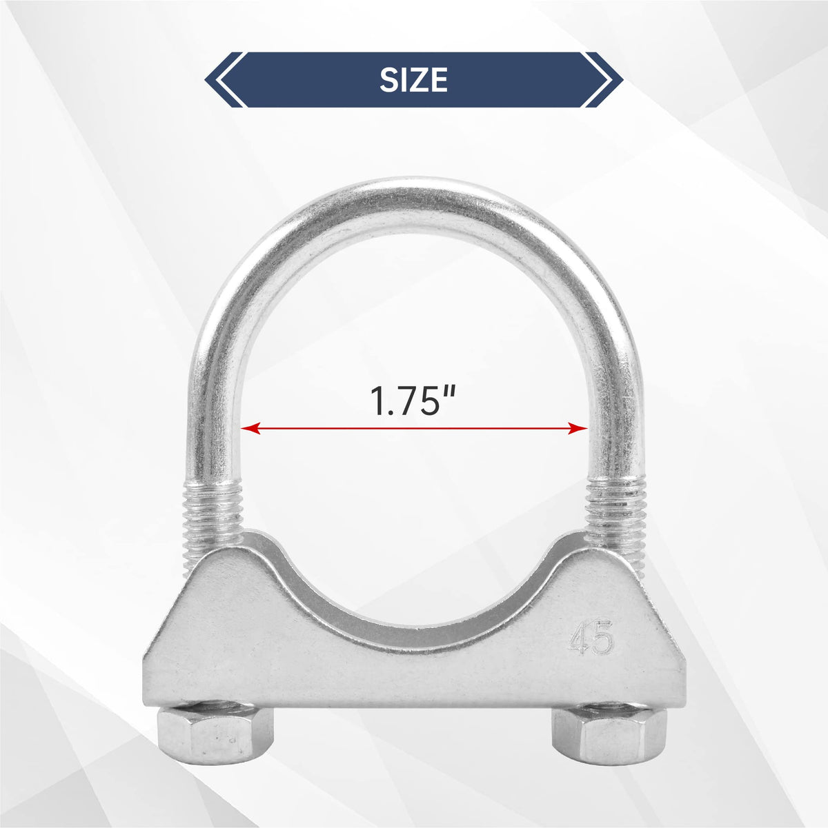100% Brand New U-Bolt | Saddle Exhaust Muffler Heavy Duty U Bolt Clamp Band Fitment:Great for 1.75'' OD pipe. such as exhaust pipe, muffler tips etcMaterial: made of Mild SteelClamp Type: U-BoltClamp Size: 1.75''Color: SilverDirectly bolt-on with no modification require Profession Installation highly recommendedAvailable in a wide range of styles and sizes Helps to ensure a leak free connection No Instruction Included.