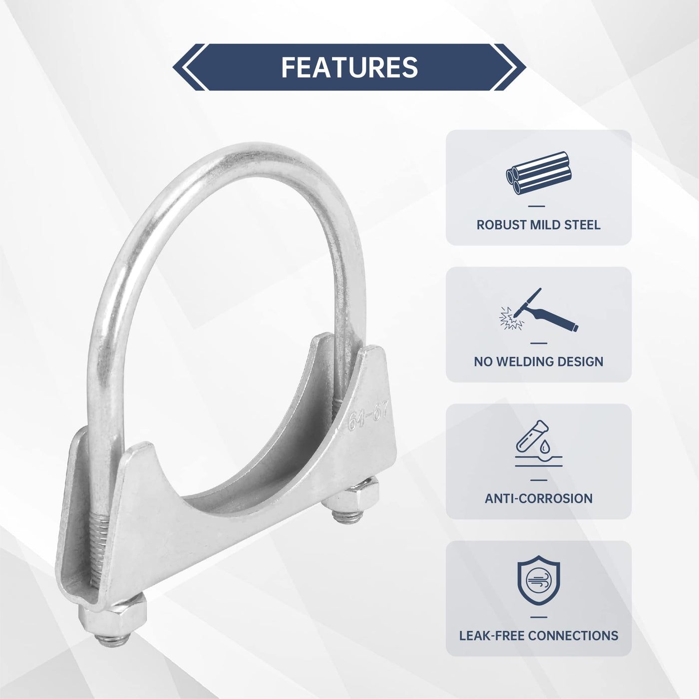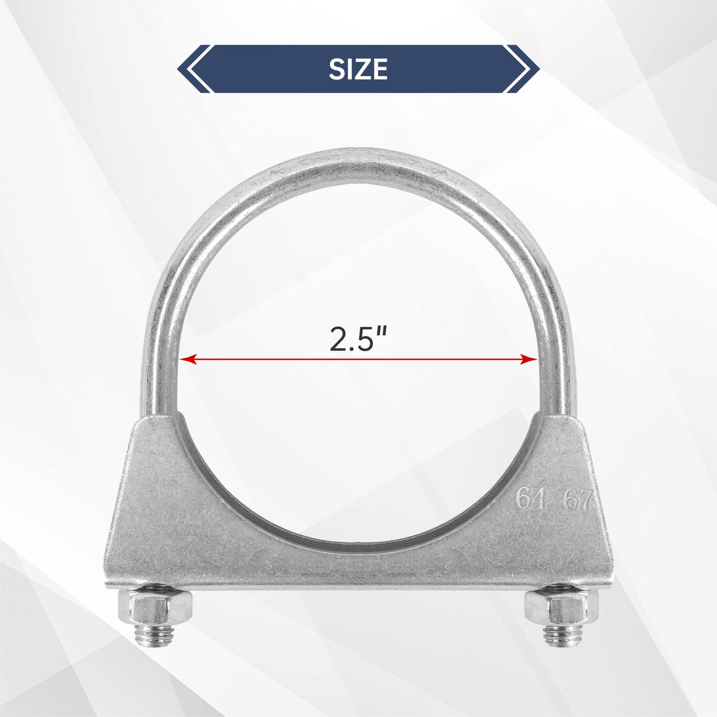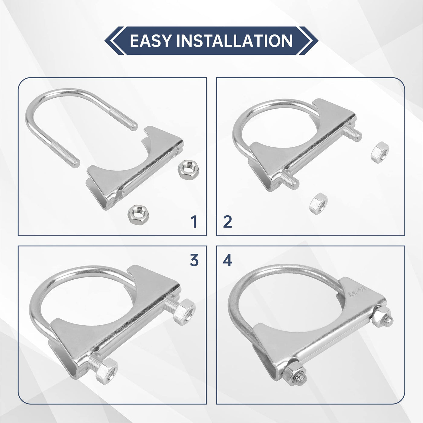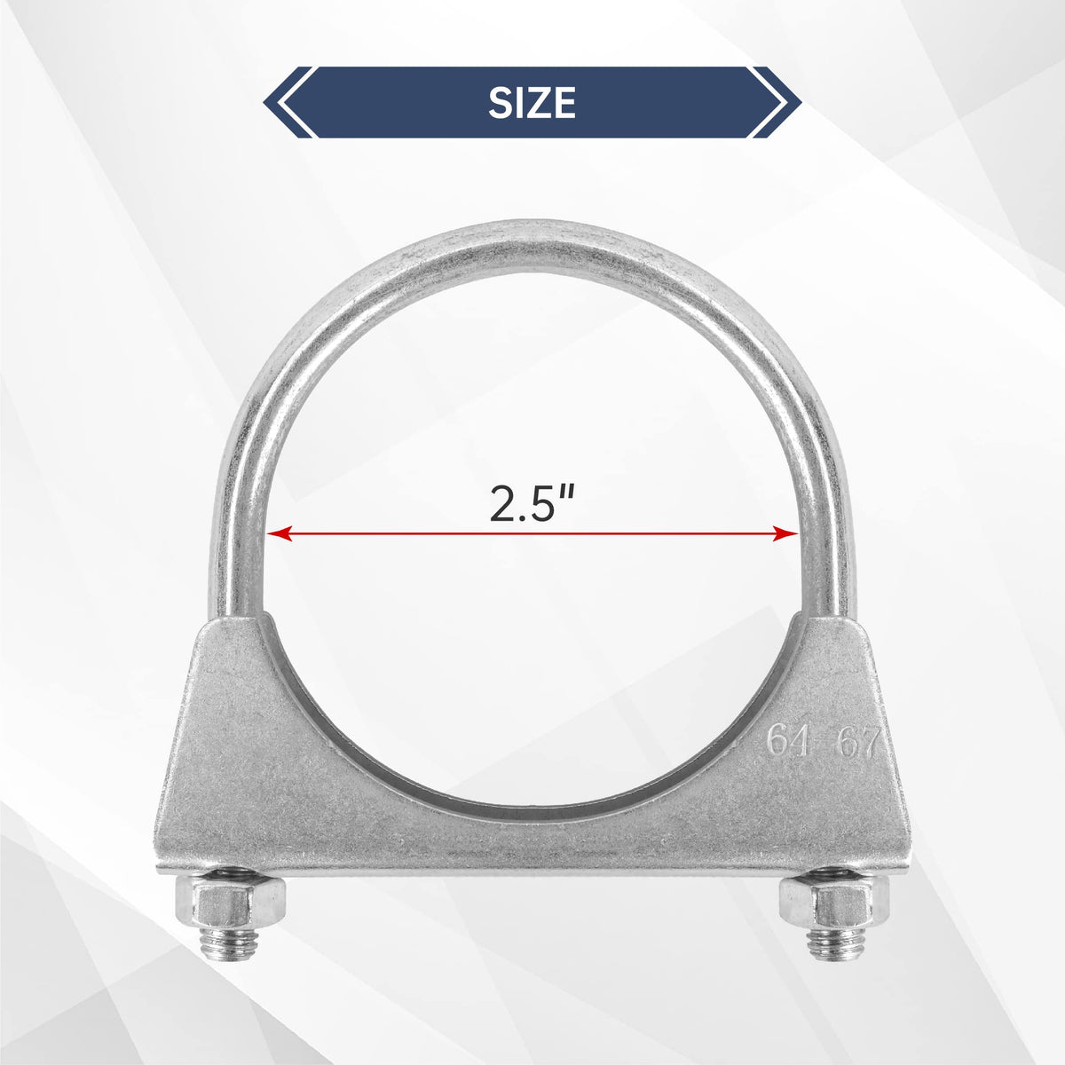 100% Brand New U-Bolt | Saddle Exhaust Muffler Heavy Duty U Bolt Clamp Band Fitment:Great for 2.5'' OD pipe. such as exhaust pipe, muffler tips etc Material: made of Mild Steel Clamp Type: U-Bolt Clamp Size: 2.5'' Color: Silver Directly bolt-on with no modification require Profession Installation highly recommended Available in a wide range of styles and sizes Helps to ensure a leak free connection No Instruction Included.