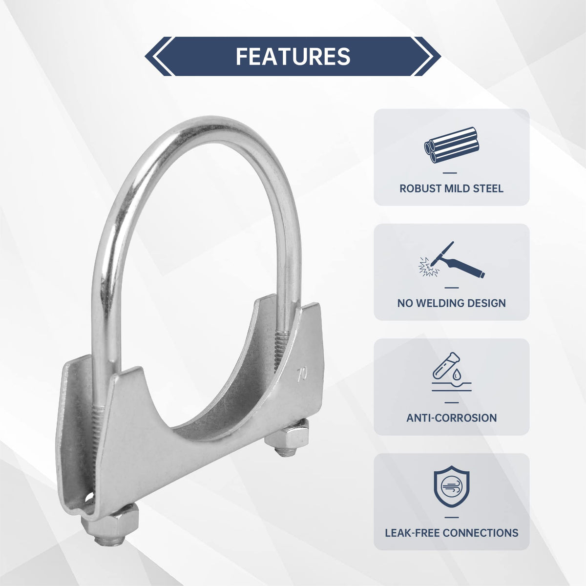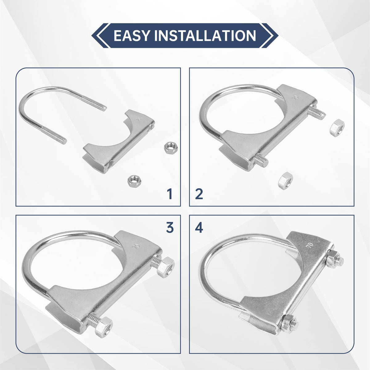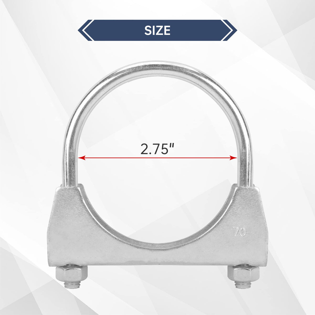 100% Brand New U-Bolt | Saddle Exhaust Muffler Heavy Duty U Bolt Clamp Band Fitment:Great for 2.5'' OD pipe. such as exhaust pipe, muffler tips etc Material: made of Mild Steel Clamp Type: U-Bolt Clamp Size: 2.5'' Color: Silver Directly bolt-on with no modification require Profession Installation highly recommended Available in a wide range of styles and sizes Helps to ensure a leak free connection No Instruction Included.