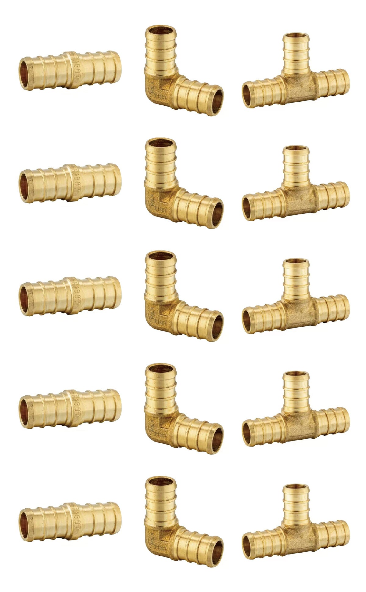 Q: What fittings are included in the EFIELD Pex-b combo kit?A: The kit includes 15 Pex crimp fittings, which consist of 5 each of coupling, elbow, and tee fittings, all designed for 1/2 inch connections.