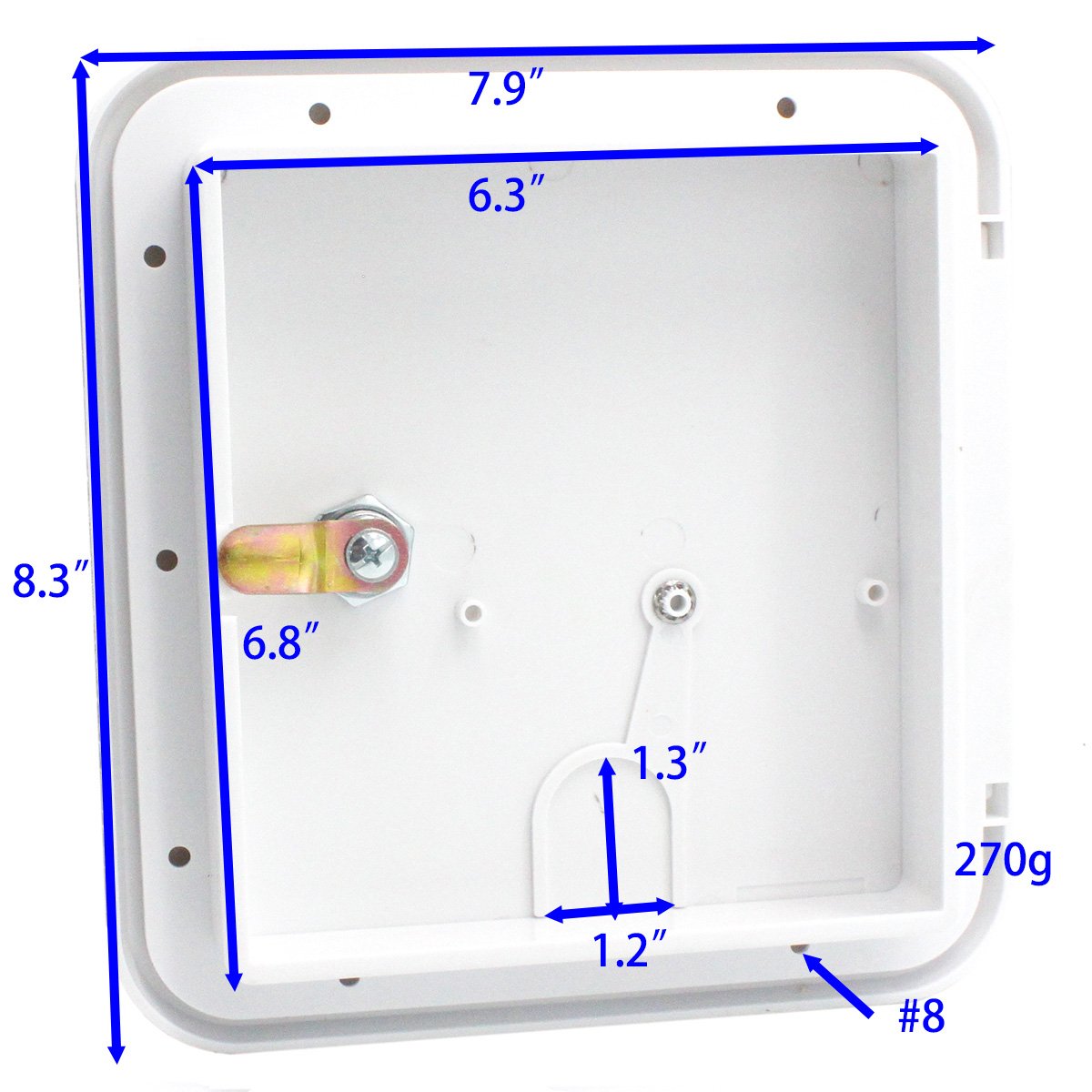 Q: What are the dimensions of the X-Haibei RV Electric Power Cord Cable Hatch Cover?A: The overall size of the X-Haibei RV Electric Power Cord Cable Hatch Cover is 8-1/2 inches by 8 inches, with a hole size of 6-1/4 inches in width and 6-3/4 inches in height.