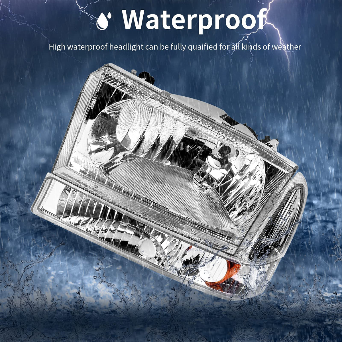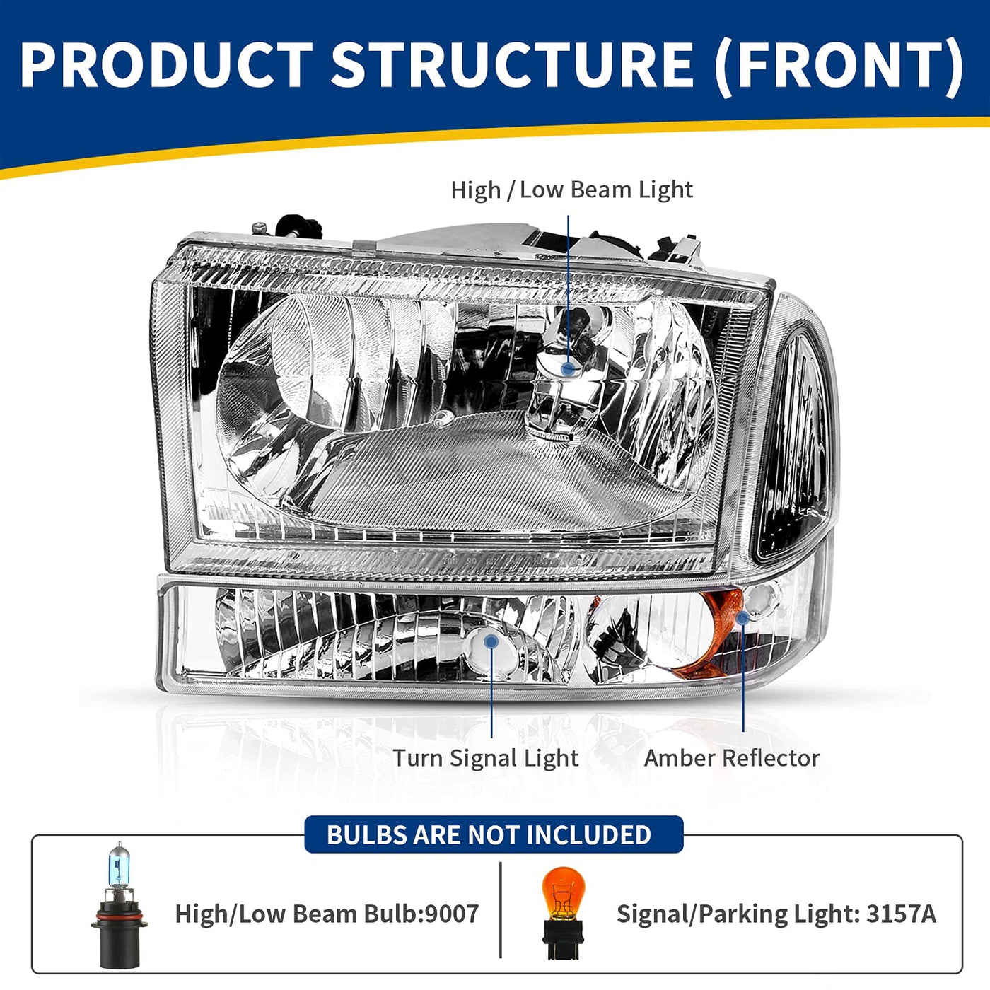 Product Description: High Beam: Hb5(Not Included) Low Beam: Hb5(Not Included) Turn Signal Light: 3157(Not Included) Replace Parts Number:2C3Z13008Ab/2C3Z13008Aa ,2C3Z13201Aa/2C3Z13200Aa Dimensions: 24.80*15.16*9.06Inch Package Includes: 2 X Headlights+Bumperlights(1X Driver'S Side & 1X Passenger'S Sides),Bulbs Are Not Included Weight:8.5Lb Fitment: 2001 2002 2003 2004 Ford Superduty