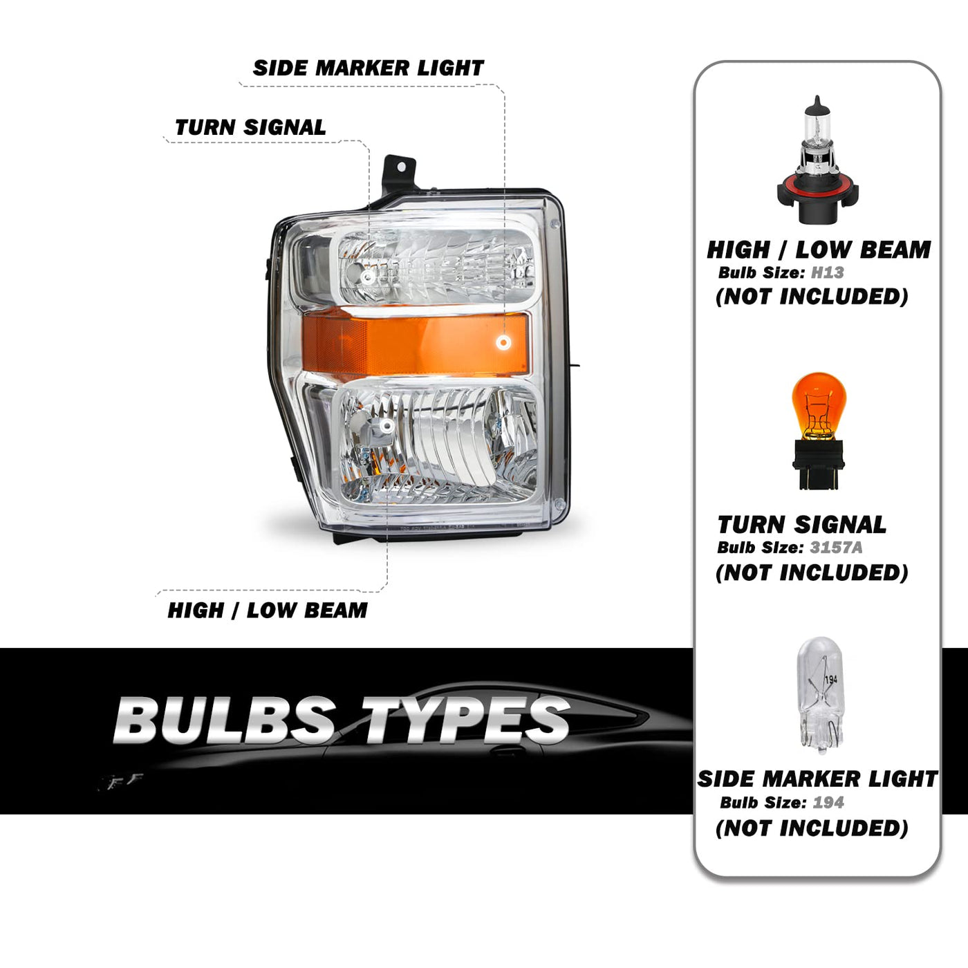 Suitable Vehicle Model: ?2008 / 2009 / 2010 Ford F-250 / F-350 / F-450 / F-550 Super Duty ?Not Compatible With Sealed Beam Headlights Models Bulbs Type: Bulbs Are Not Included. Please Reuse Original Bulbs. ? High / Low Beam: H13 ? Bulbs Are Not Included.