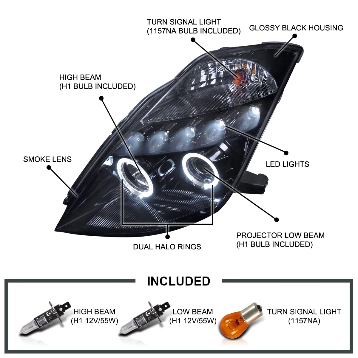 Spec-D Tuning Black Smoke Led Halo Projector Headlights Compatible With 2003-2005 Nissan 350Z, Left + Right Pair Headlamps Assembly