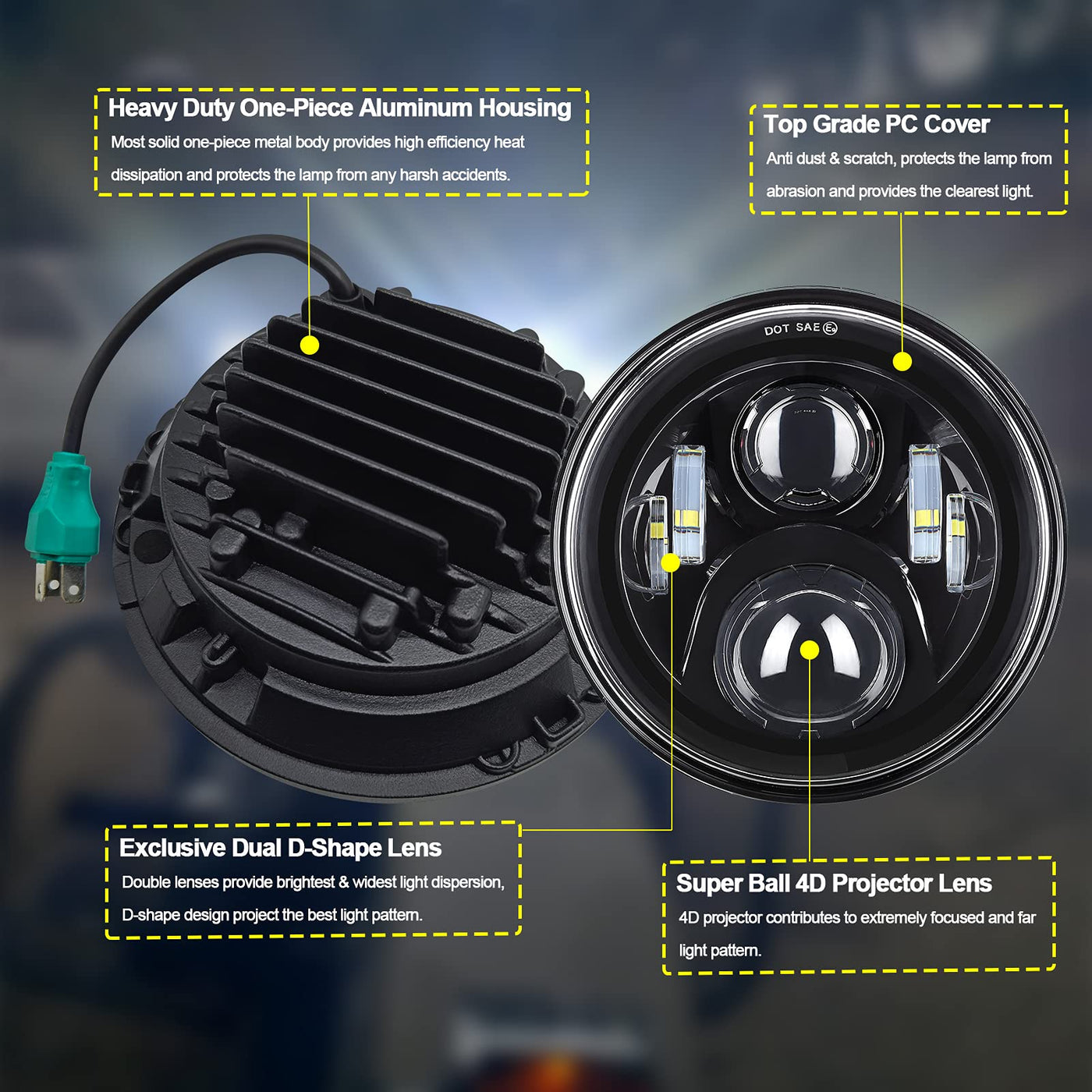 Q: What materials are used in the construction of the headlight?A: The headlight housing is made from aluminum alloy, and the lens is made from polycarbonate. These materials ensure durability and weather resistance.