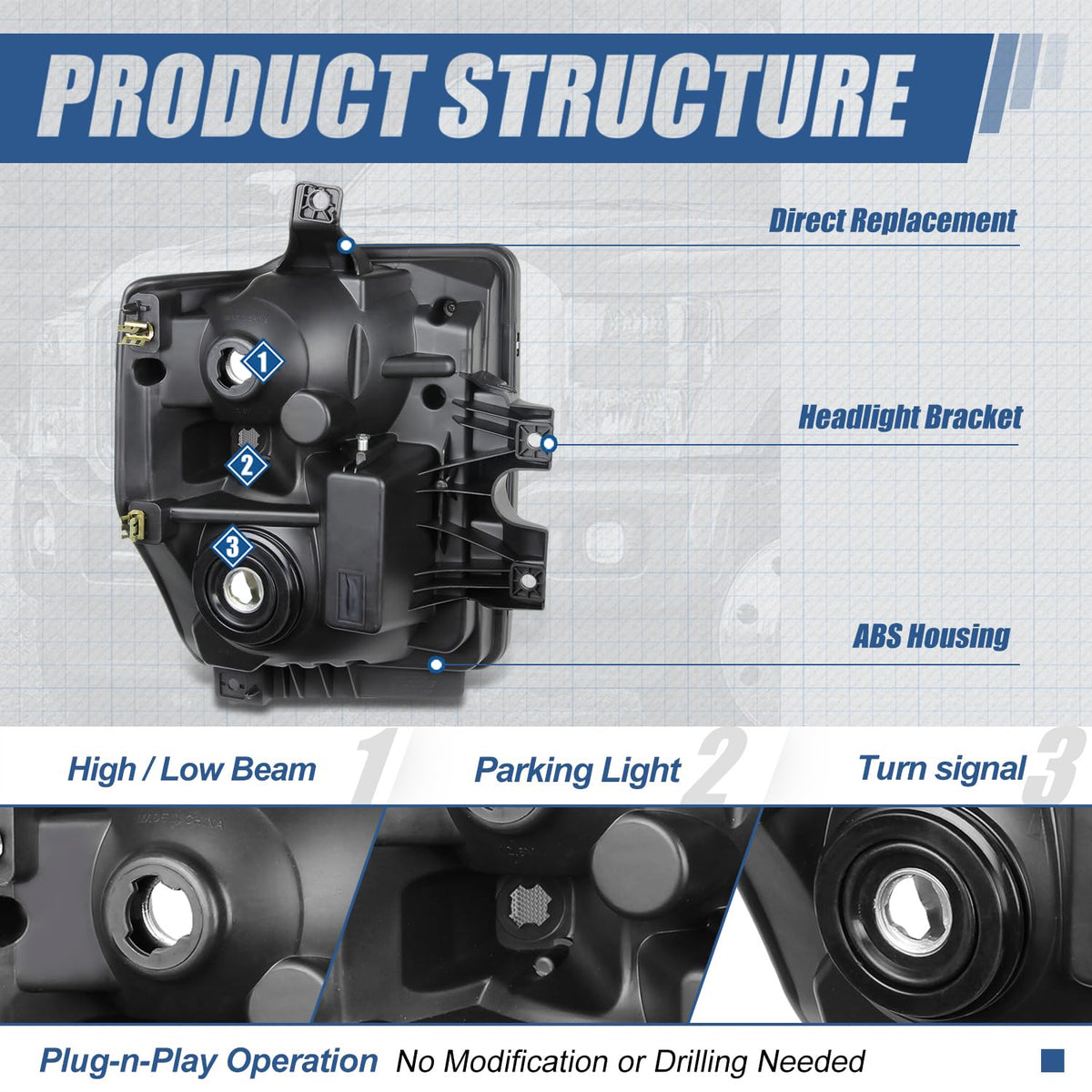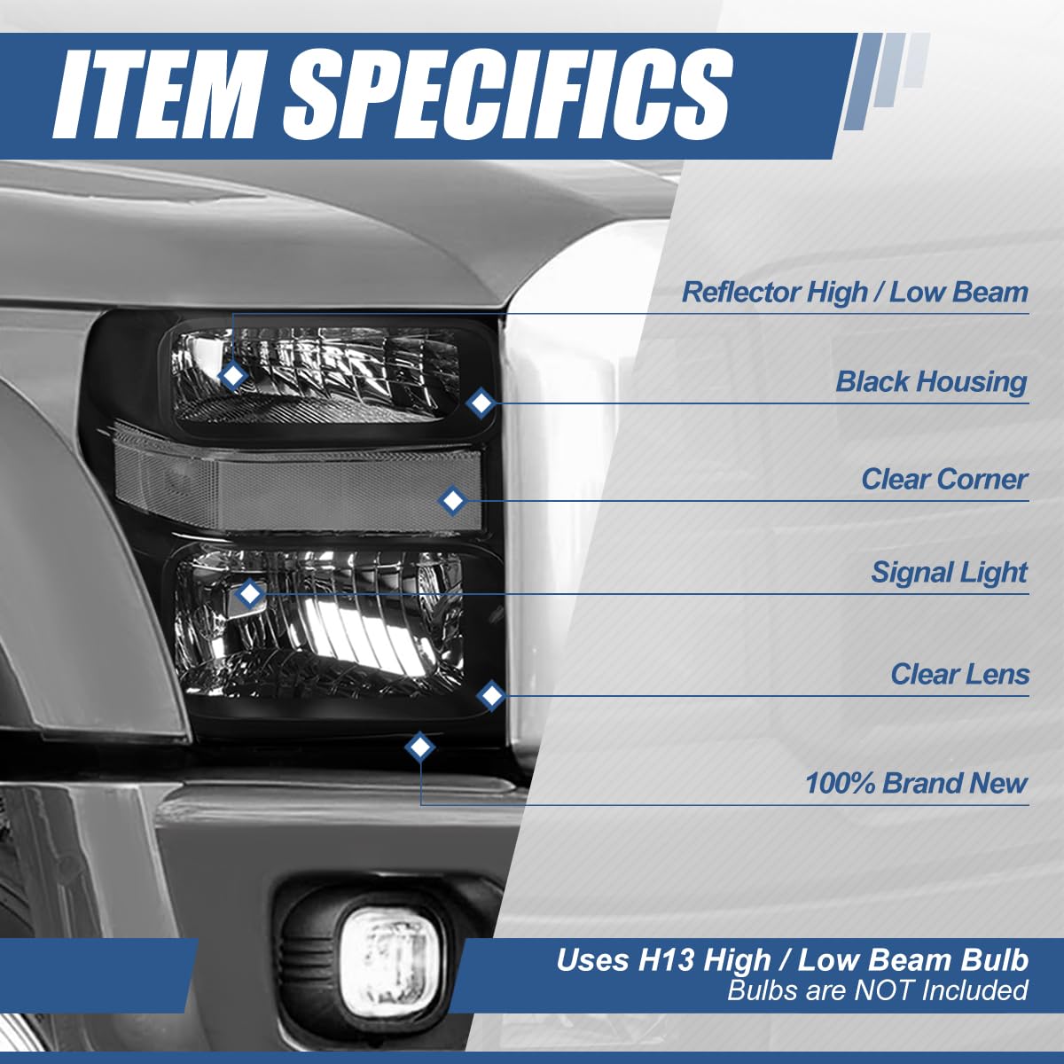 A Headlight (headlamp) is a lamp attached to the front of a vehicle to light the road ahead. Headlight performance has steadily improved throughout the automobile age, spurred by the great disparity between daytime and nighttime traffic fatalities. Headlights are one of the most important components of your vehicle; they allow you to see the road in front of you clearly during the night and in any bad weather that may arise. Our headlights upgrade the face of your vehicle with clear style and extreme range.Package Included:1 x Pair of HeadlightsThis product is compatible with:Compatible with Ford F-250 / F-350 / F-450 / F-550 Super Duty 2008-2010