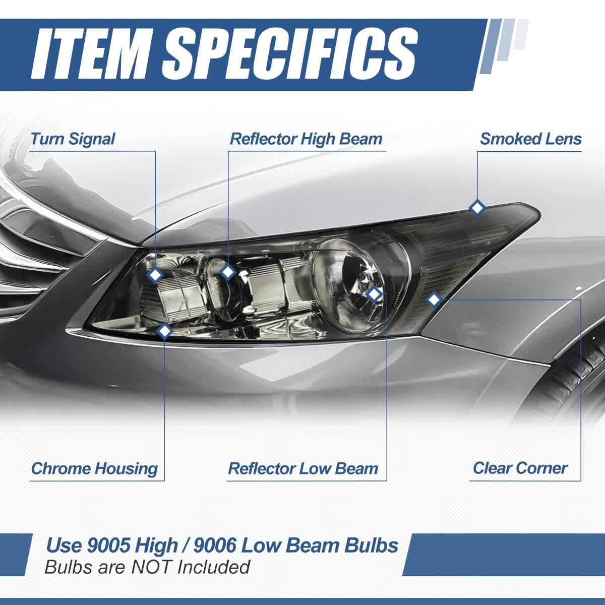 A Headlight (headlamp) is a lamp attached to the front of a vehicle to light the road ahead. Headlight performance has steadily improved throughout the automobile age, spurred by the great disparity between daytime and nighttime traffic fatalities. Headlights are one of the most important components of your vehicle; they allow you to see the road in front of you clearly during the night and in any bad weather that may arise. Our headlights upgrade the face of your vehicle with clear style and extreme range.Package Included:1 x Pair of Headlights (Left & Right)This product is compatible with:08-12 Honda Accord 4-Door