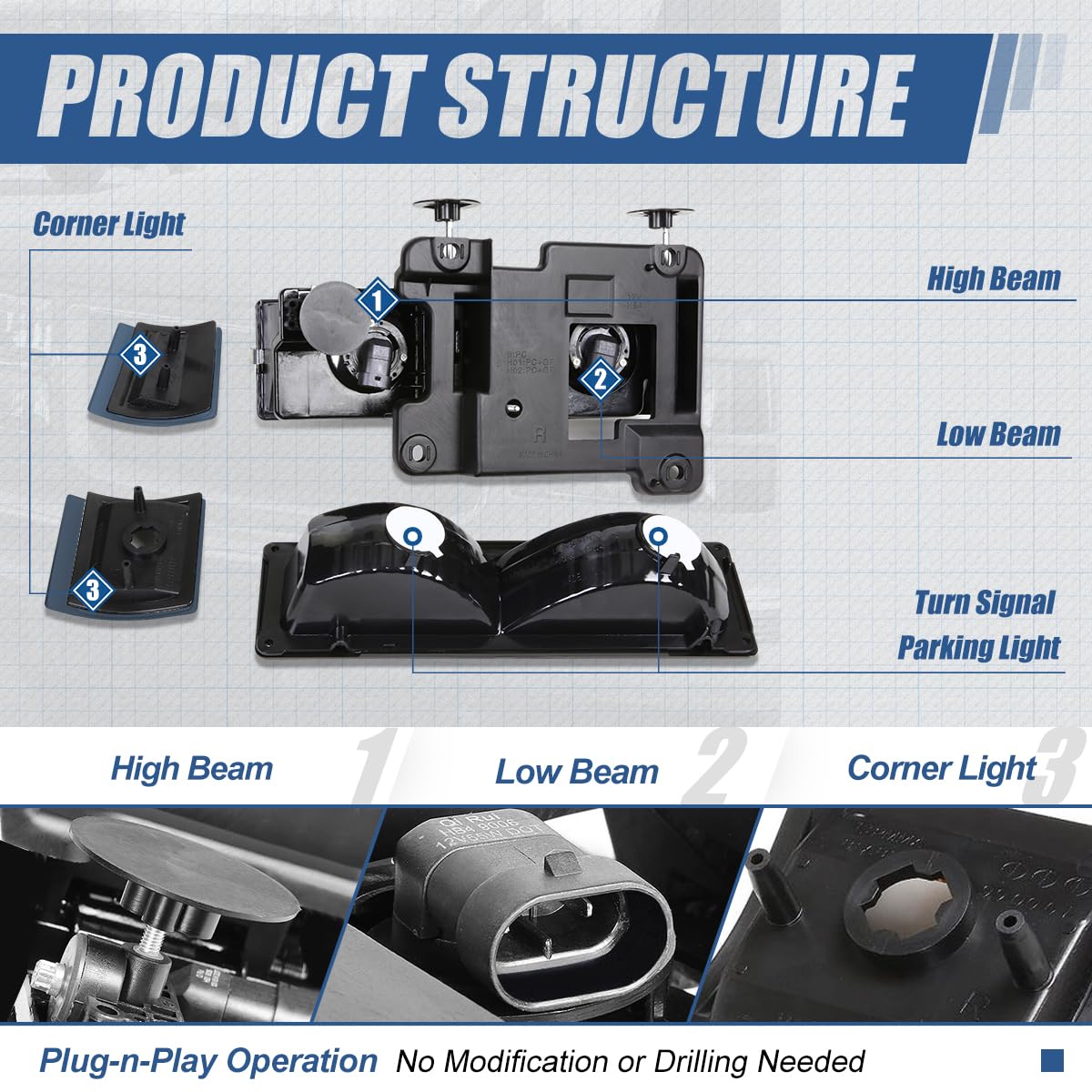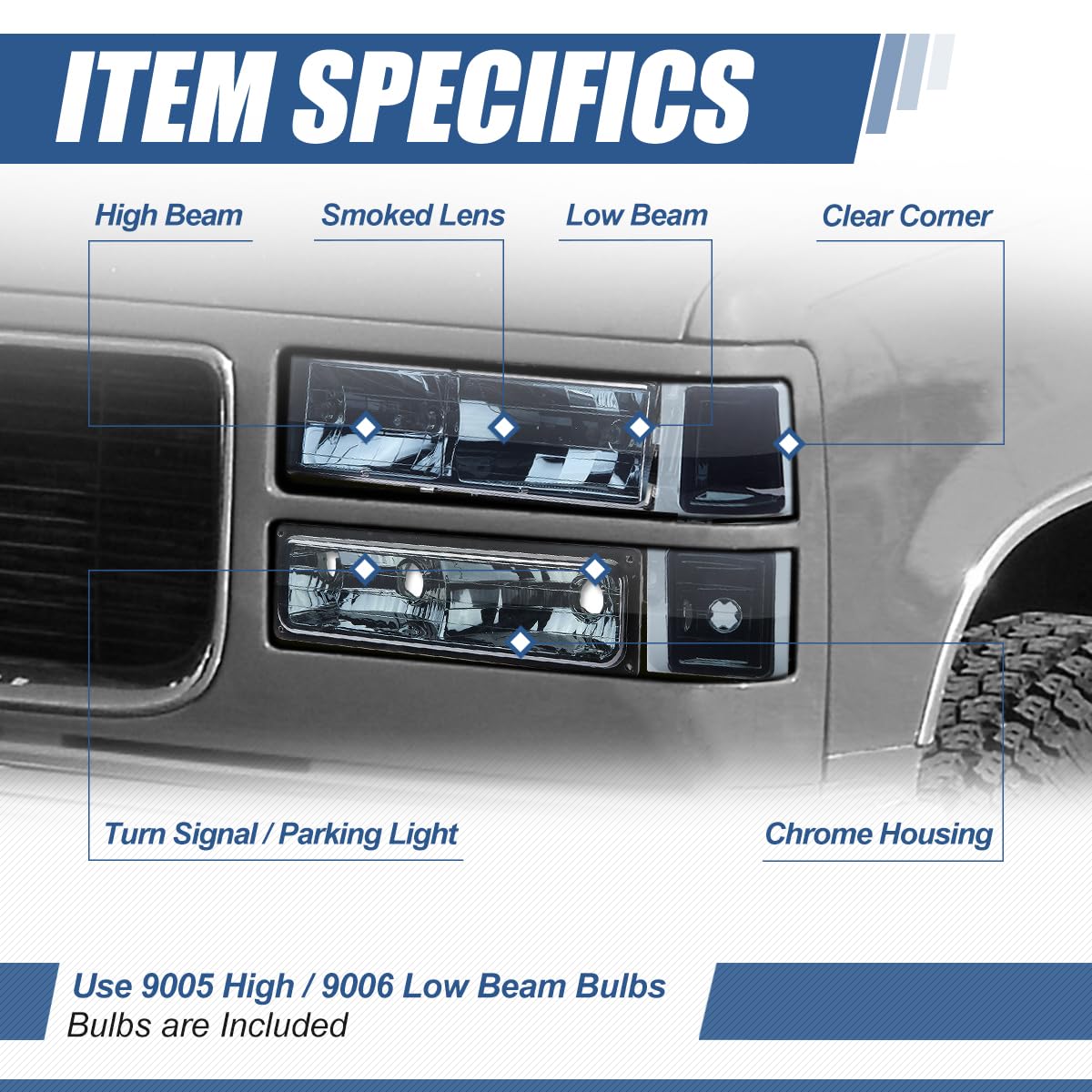 Auto Dynasty Headlights Assembly Compatible With 1994-1998 Chevy C10 Silverado Tahoe Suburban C/K 1500 2500 3500 Blazer, 8Pcs Ha