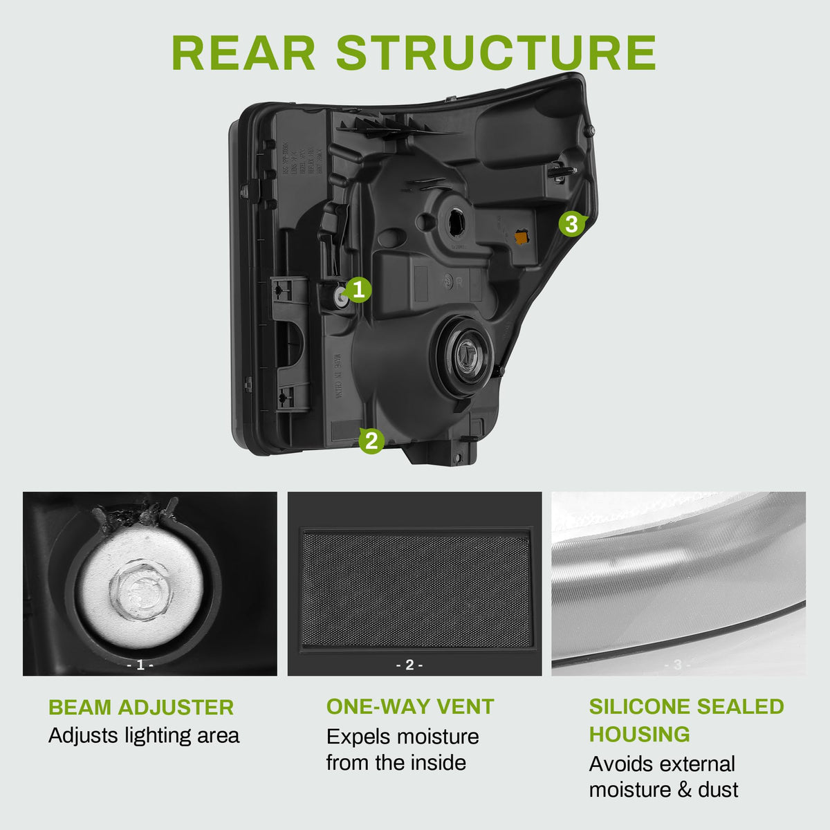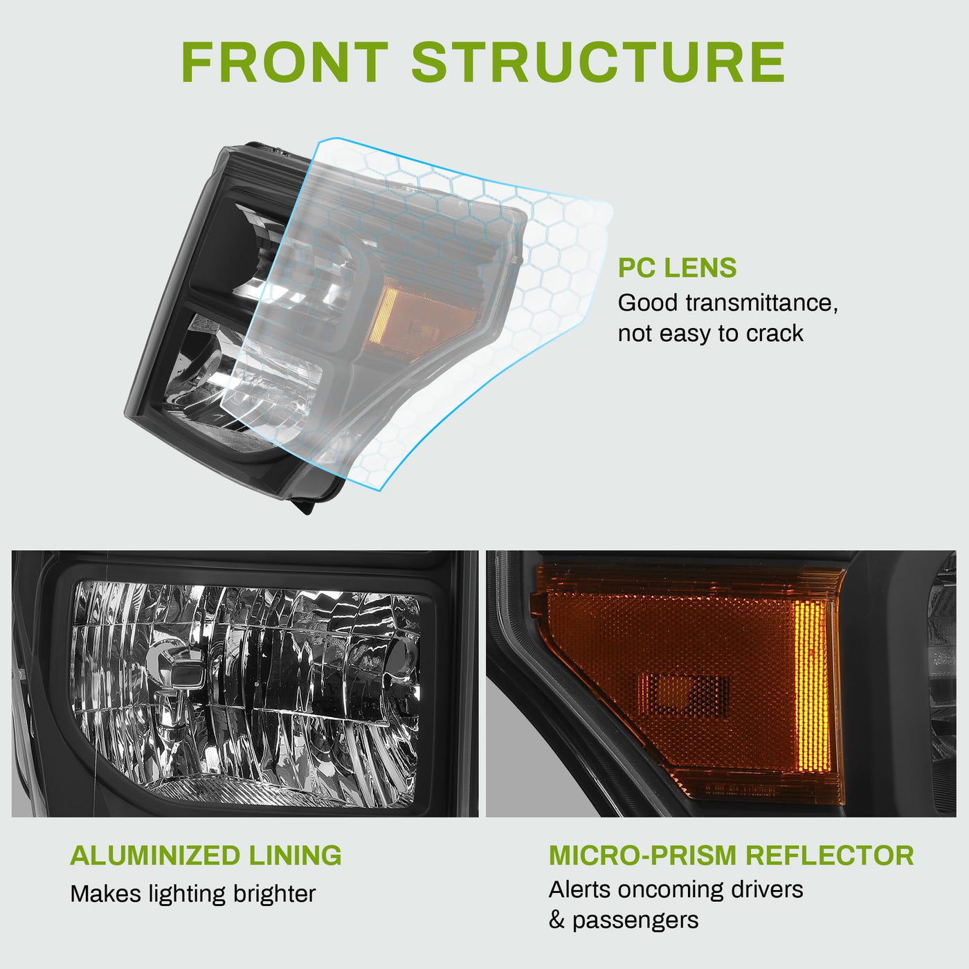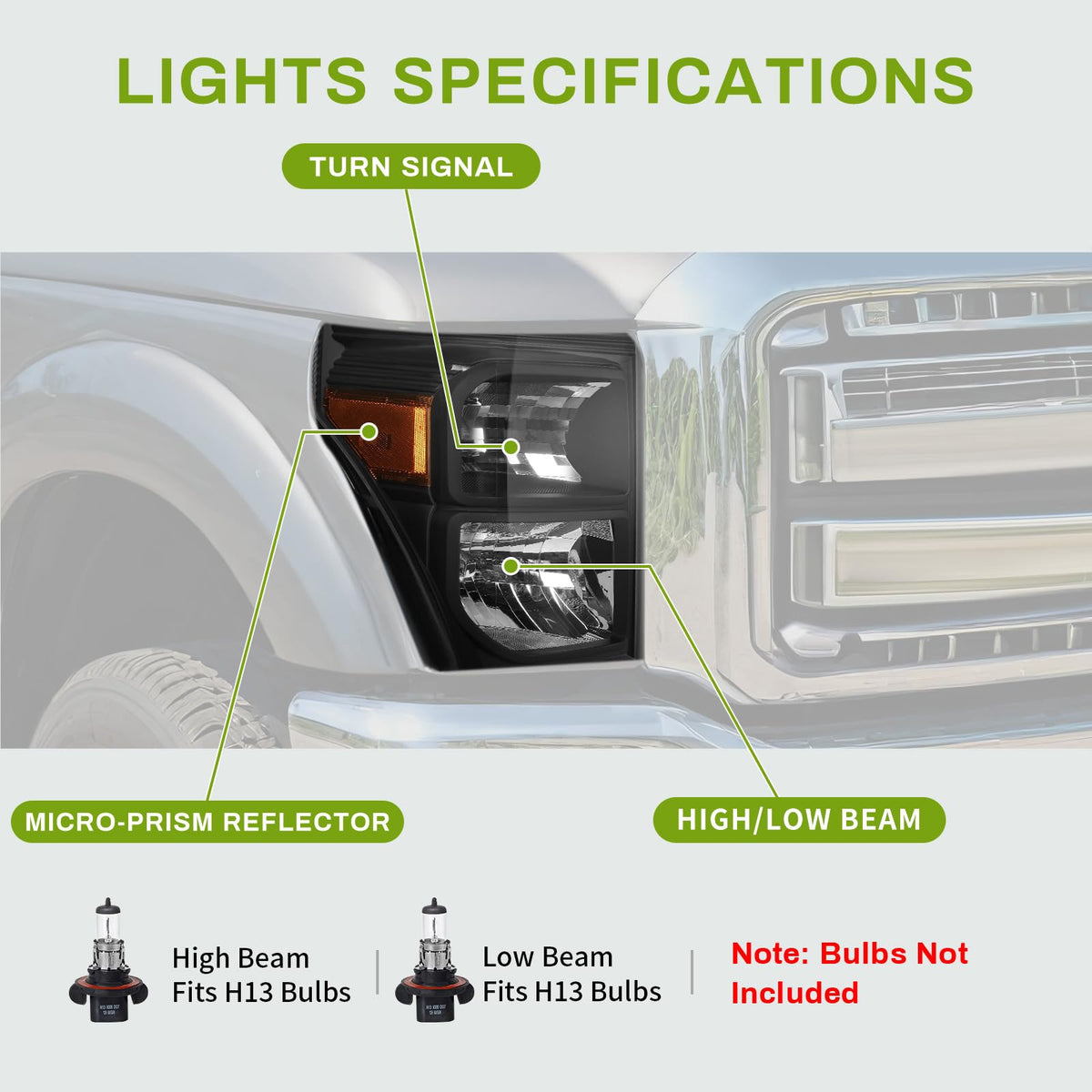 Vehicle compatibility: the headlights assembly is compatible with 11 12 13 14 15 16 Ford F250 F350 F450 F550 Super Duty.Low Beam:H13 / High Beam H13(Bulb are not included) | Waterproof: fully sealed with solid silicon & designed with one-way vents to prevent moisture from being trapped inside the housing, no corrosion or moisture worries in sorts of weather conditions such as rain, snow or dust storms | Brighter lighting: the metallic parabolic reflectors provide more light output to create a broader and smoother beam; and anti-glare hood helps focus the light and makes lighting more uniform | Safety reflector: the sided micro-prism reflector makes the oncoming cars or passerby quickly notice you at night, ensuring your driving safety and others' | Impact resistance: the polycarbonate lens & tough housing are highly resistant to shock, vibration for any tough road; professional installation would be highly recommended