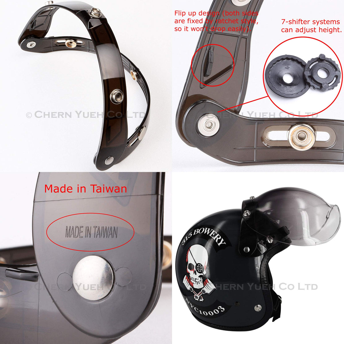 Please press hard to hear the card click sound before the installation is completed. If it is not installed completely, it will blow out of the helmet while riding.Fits most 3 snap shield configuration on most novelty and DOT helmets (Buco, Shoei, BELL, Arai, Biltwell, SIMPSON, AGV, HJC, AFX, Ruby and so on...).Meets CNS safety standards.High quality made in Taiwan (Not in China).* Helmet Not Included.