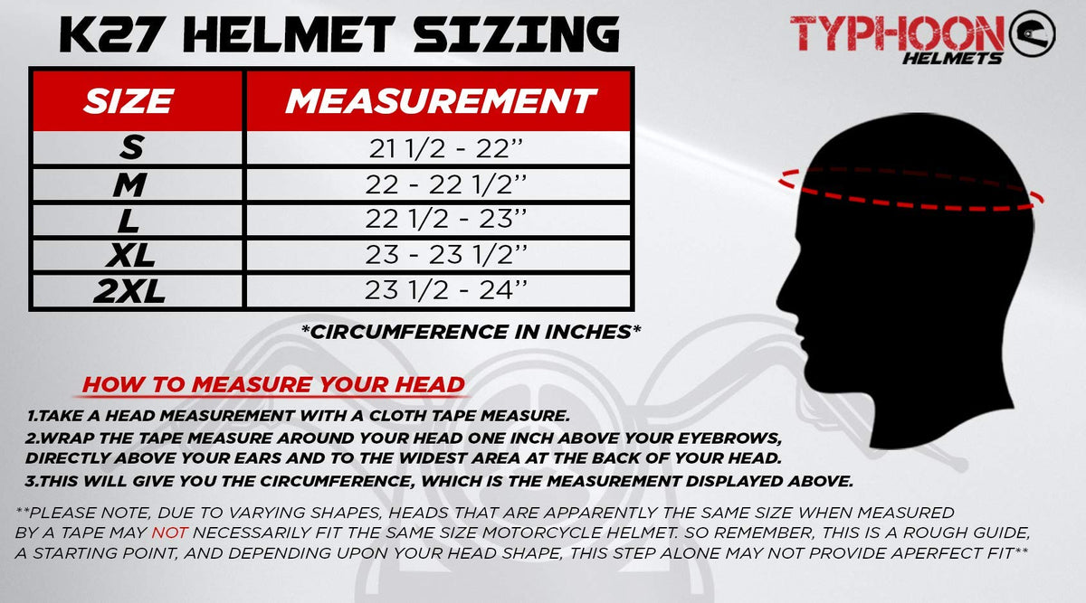 Q: What sizes are available for the Typhoon ATV Motorcycle Helmet?A: The Typhoon ATV Motorcycle Helmet is available in various sizes including Small, Medium, Large, XL, and XXL. To ensure a proper fit, measure the circumference of your head just above the eyebrows and refer to the size chart: Small (21 ½ to 22 inches), Medium (22 to 22 ½ inches), Large (22 ½ to 23 inches), XL (23 to 23 ½ inches), and XXL (23 ½ to 24 inches).