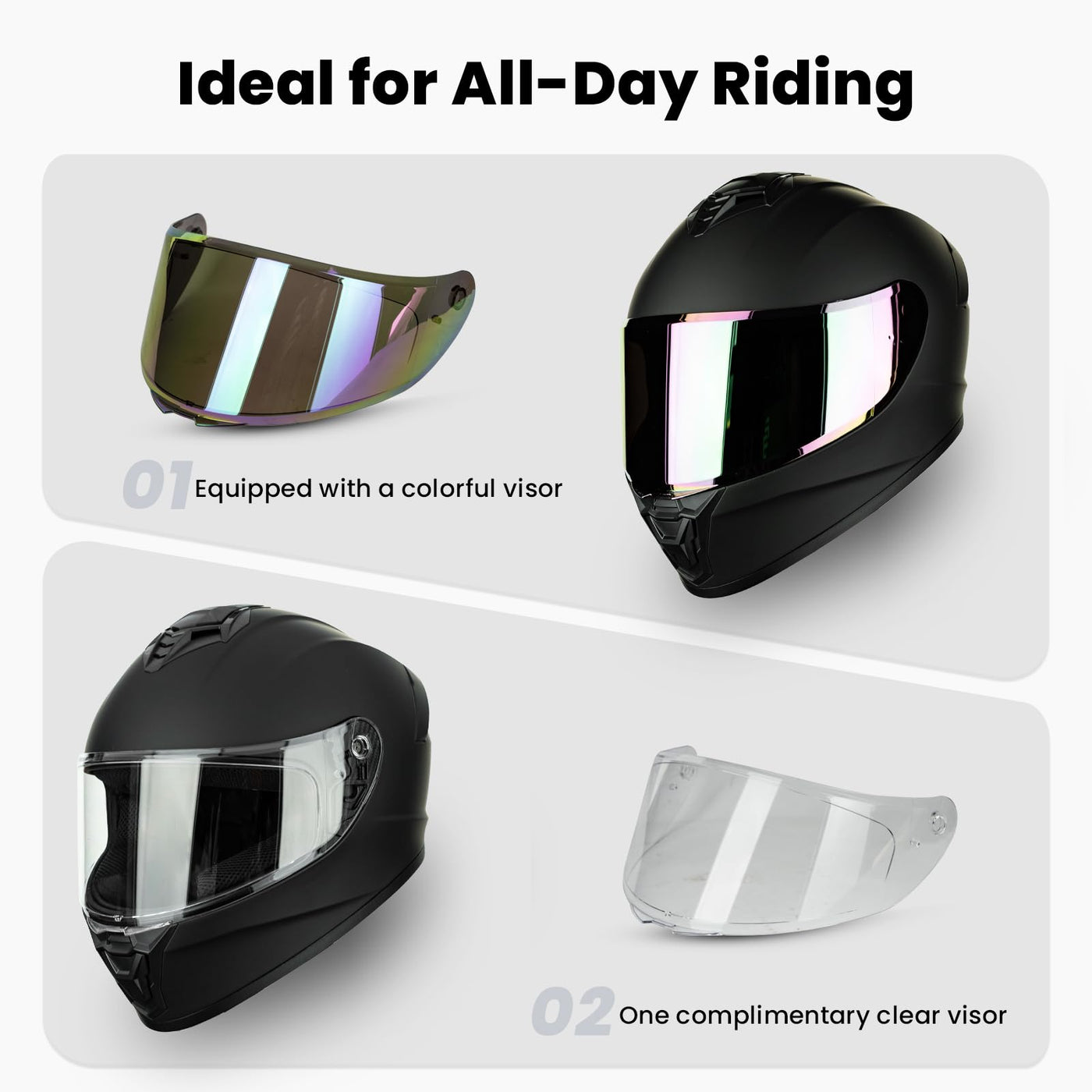 Q: Does the helmet come with visors, and how do they enhance visibility?A: Yes, the helmet includes a colorful visor and a replacement clear visor, providing excellent visibility for both day and night riding conditions, ensuring a safer riding experience.