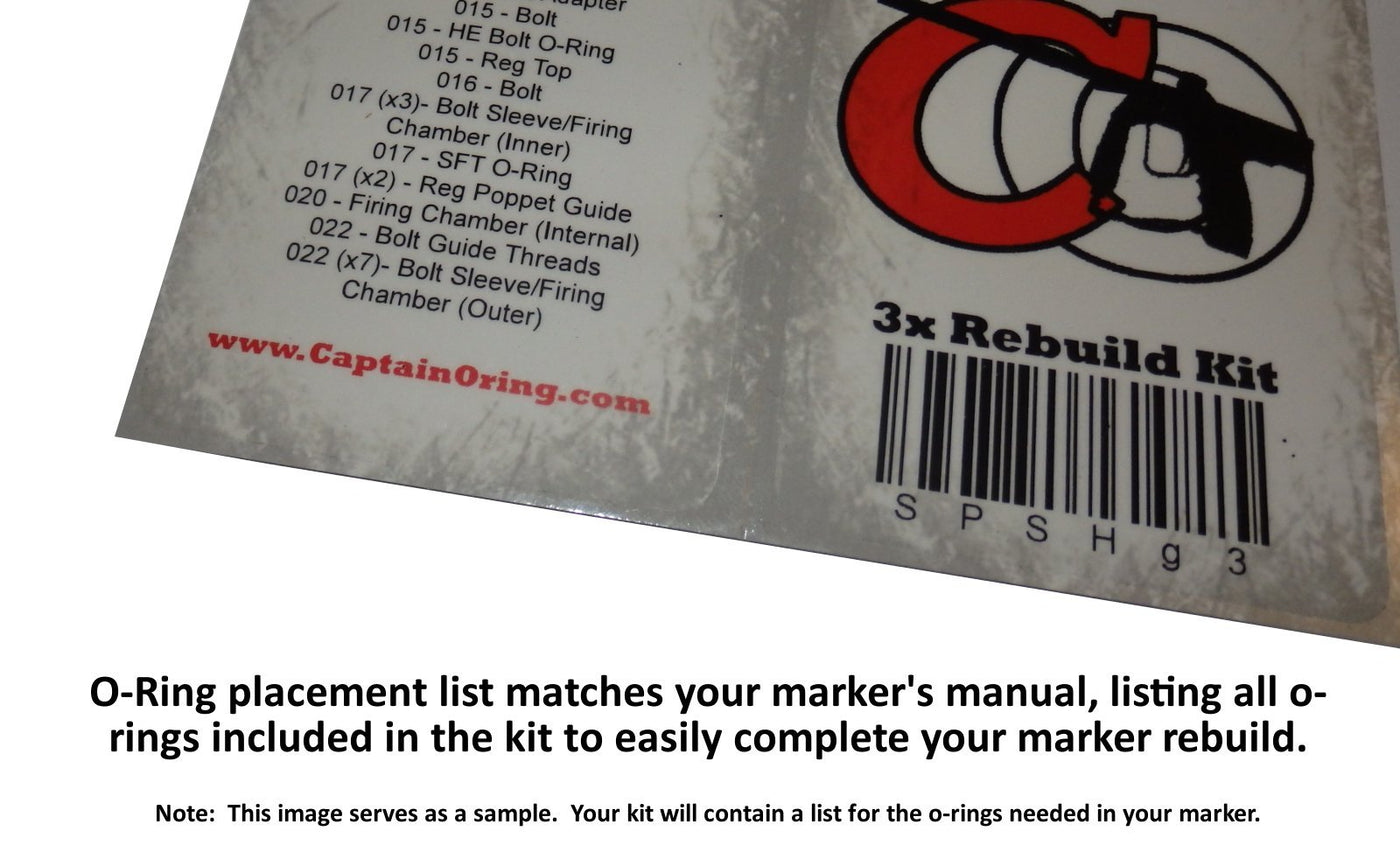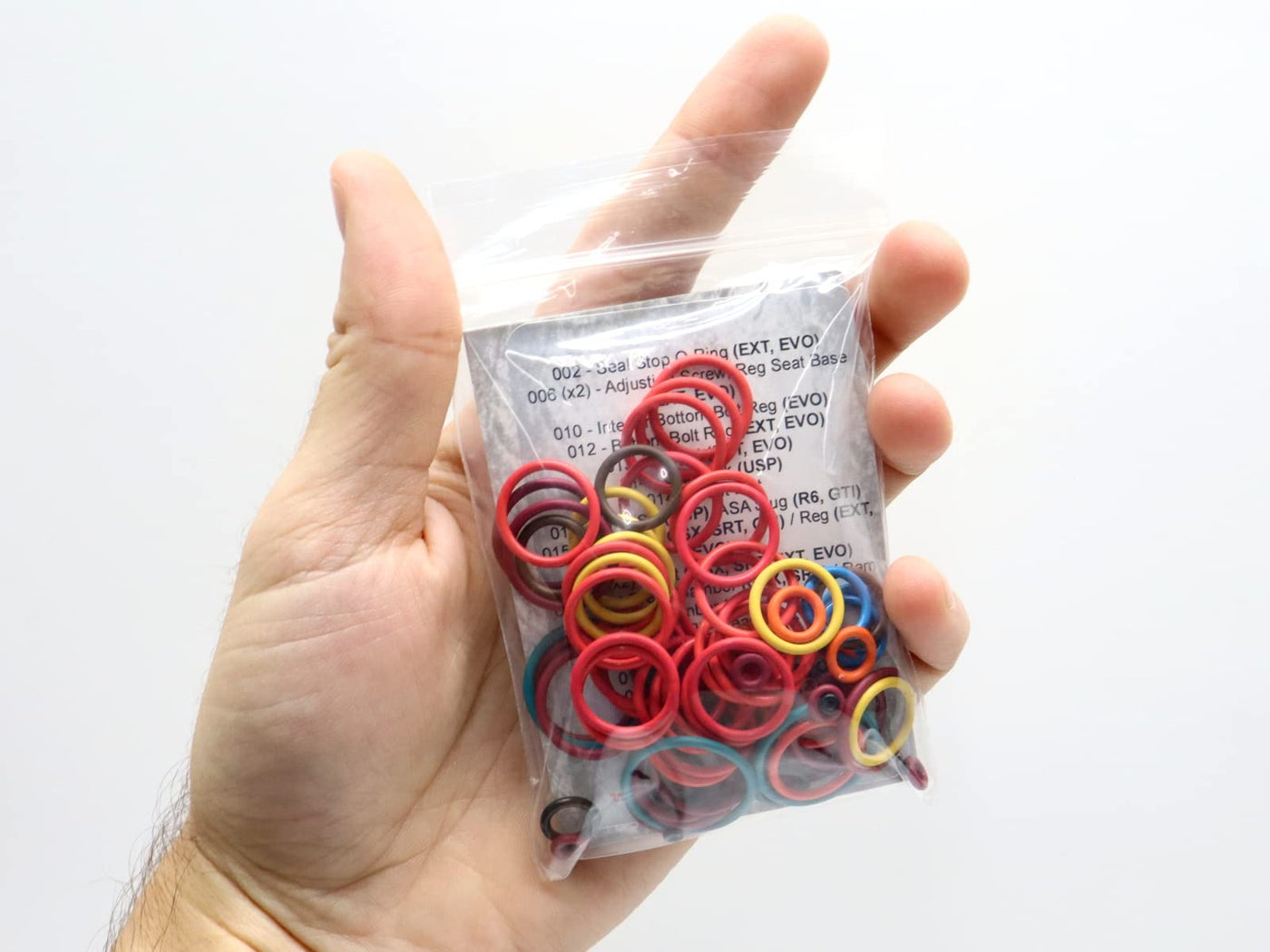 Your marker can fire thousands of rounds every week, puts up with the beating of countless rainy Sundays, and withstands a number of slides through the dirt and mud. Through all of this, you still expect your marker to perform week in and week out. A small bit of maintenance is key to ensuring that your marker functions and performs at its best. One major aspect of marker maintenance is replacing your o-rings. The o-rings in your marker wear down over time by withstanding thousands of cycles along with coming in contact with dirt/debris. Our kits provide an easy and inexpensive way to keep your marker in top shape by swapping out your o-rings. Note: The product image associated with this item is a sample only. You will receive the kit for your specific marker(s) that you order which will contain the o-rings needed for that marker. The Captain O-Ring Piranha USP, R6, GTI, GSX, SRT, EXT, EVO 3x Color Coded O-Ring Kit includes 3x all parts below (for example, if an o-ring displays x2, then 6 of that o-ring will be included). - Seal Stop O-Ring (EXT, EVO) (x2) - Adjusting Screw, Reg Seat Base (EXT, EVO) - Interior Bottom Bolt Reg (EVO) - Bottom Bolt Reg (EXT, EVO) - Poppet (EXT, EVO) - Clip Lock (USP) - Front Bolt (x2) - ASA (USP), ASA Slug (R6, GTI) - Gas-Thru (GSX, SRT, GTI) / Reg (EXT, EVO) (x2) - Bolt (GSX, SRT, EXT, EVO) - Opt Pres Chamber (GSX, SRT) / Ram Air Chamber (EXT, EVO) (x2) - Rear Block (x2) - Valve (x2) - ASA, Blue Hammer (x2) - Piston (EXT, EVO) - Barrel O-Ring - Velocity Screw