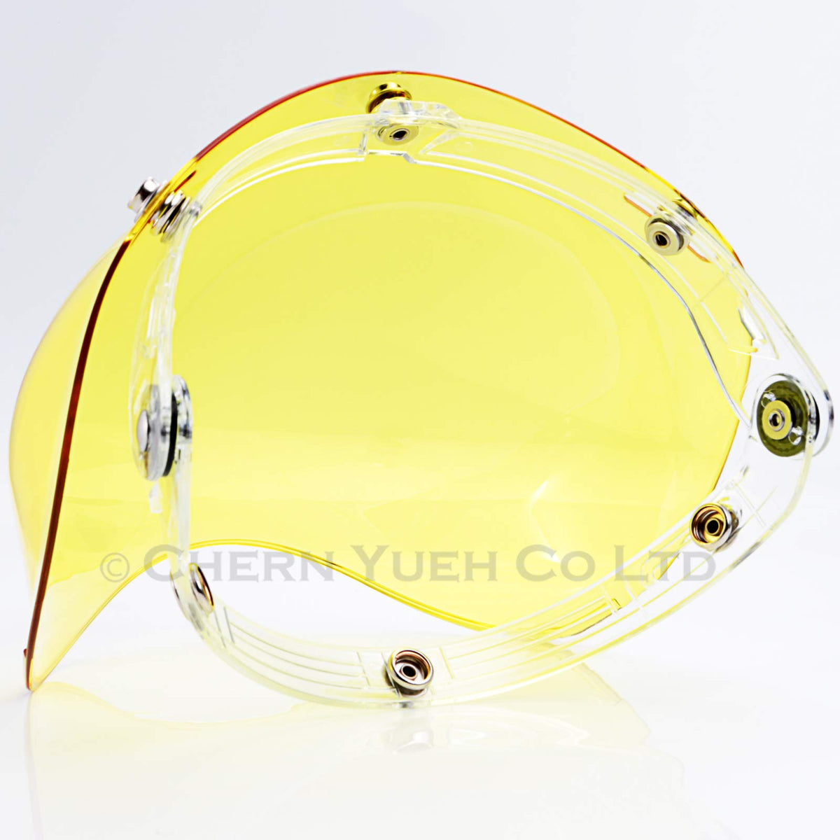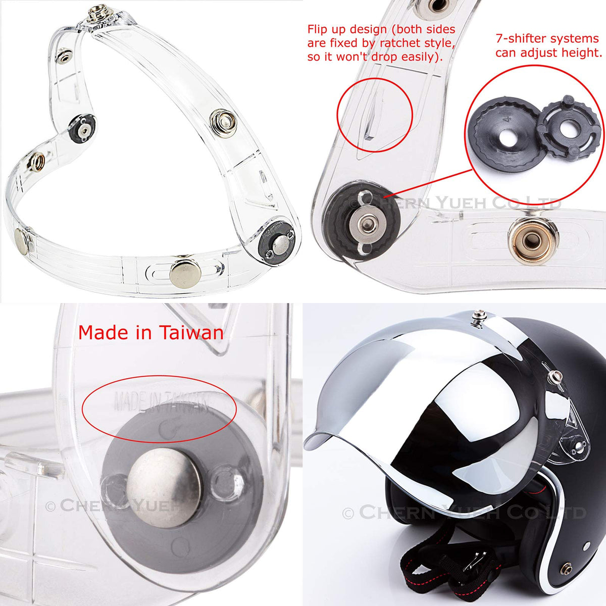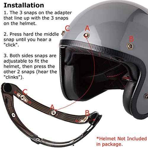 Please press hard to hear the ''card'' click sound before the installation is completed. If it is not installed completely, it will blow out of the helmet while riding.Fits most 3 snap shield configuration on most novelty and DOT helmets (Buco, Shoei, BELL, Arai, Biltwell, SIMPSON, AGV, HJC, AFX, Ruby and so on...).Meets CNS safety standards.High quality made in Taiwan (Not in China).* Helmet Not Included.