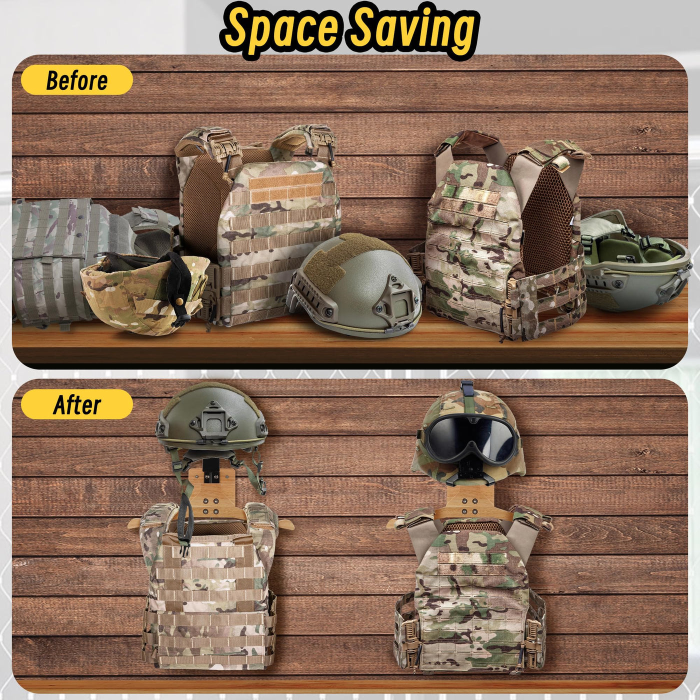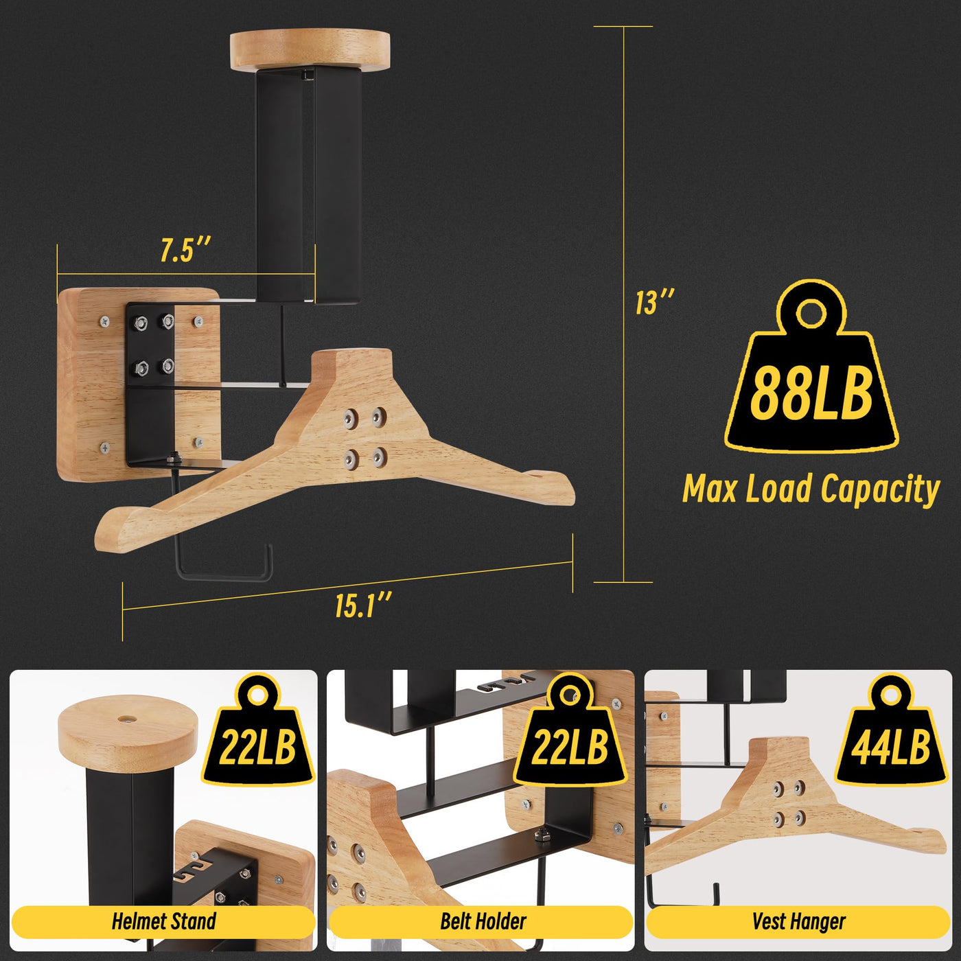 Q: How much weight can this helmet holder support?A: This tactical helmet wall mount can hold up to 88lbs. It offers a helmet rack capacity of 22lbs, a vest hanger rack capacity of 44lbs, and a belt rack capacity of 22lbs, making it a reliable storage solution.