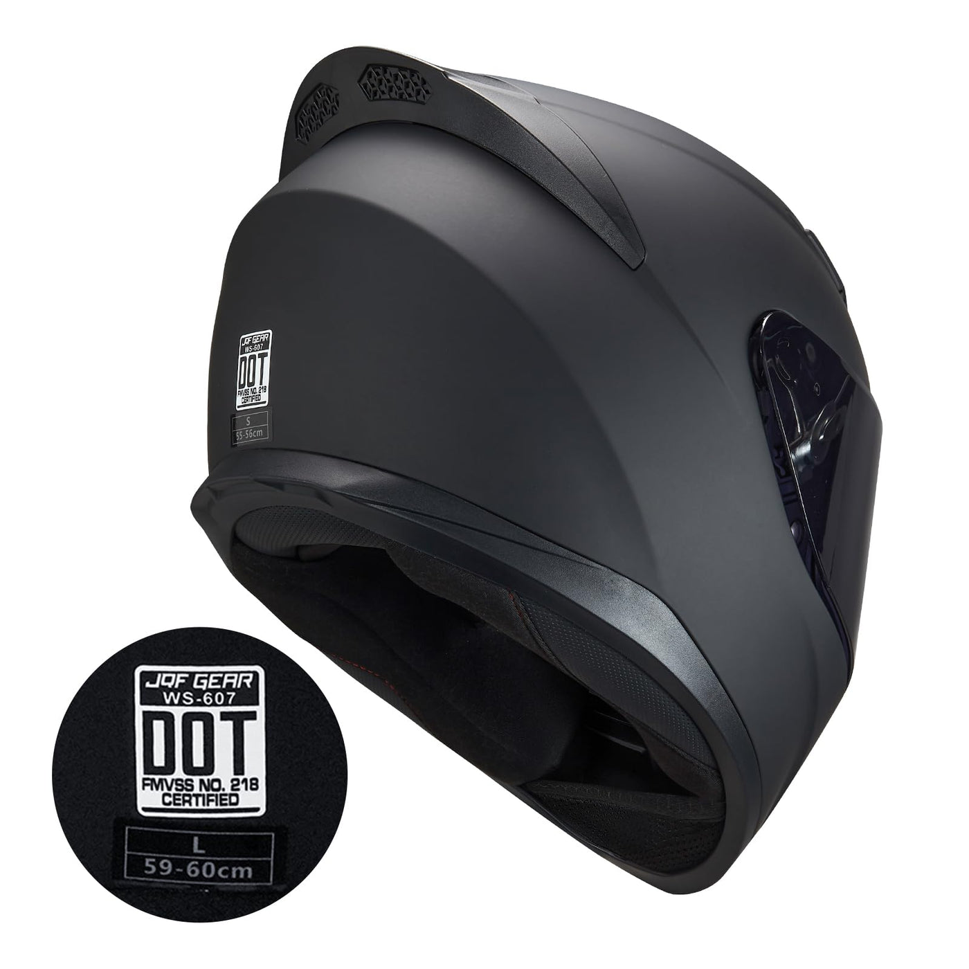 JQF Gear Full Face Motorcycle Helmet - DOT Approved Motorcycle Helmets for Adults Men and Women, WS-607 Black Motorbike Racing Street Bike Helmet About Cascos Para Motos Para Hombre: Full face helmets motorcycle suit ATV, motocross, street bike, dirt bike, motorcycle, mountain bike, touring, dual sports and other outdoor riding activities. - Three different visor color combinations (No clear visor): 1.motorcycle helmets with Black visor (recommended for daytime use); 2.motorcycle helmet with Chrome Silver visor (recommended for daytime use); 3.cascos para motos with Chrome Red visor (recommended day and night use) - Material: Lightweight ABS shell and Multi-Density EPS material for safe riding. - Quick release chin strap: The quick release chin strap design is easy and quick to use. - Removeable Lining: The lining of the helmets for adults are removable, washable and replaceable for comfort and breathability. - Ventilation & Heat Dissipation: The full face helmet for adults has multiple vents designed to provide optimal ventilation and cooling, suitable for any riding environment in summer or winter. - Adult Size: Adult-S: 55-56 CM/ 21-5/8 - 22 inch Adult-M: 57-58 CM/ 22-1/2 - 22-7/8 inch Adult-L: 59-60 CM/ 23-1/4 - 23-5/8 inch Adult-XL: 61-62 CM/ 24 - 24-3/8 inch Adult-XXL: 63-64 CM/ 24-3/4 - 25-1/4 inch If you have a larger head circumference or your cheeks are a little chubby, please size up. For Customer: If you have any questions or product problems when receive our racing helmets, please feel free to contact JQF Gear. We will contact you and help to solve in 24 hours.