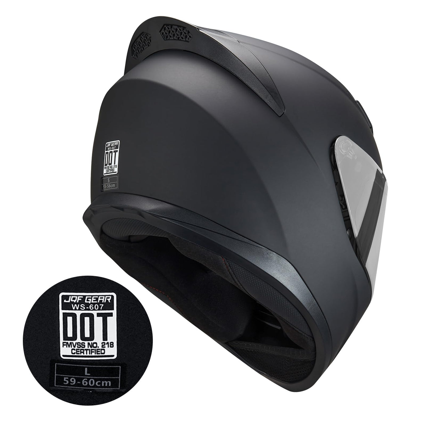 JQF Gear Full Face Motorcycle Helmet - DOT Approved Motorcycle Helmets for Adults Men and Women, WS-607 Black Motorbike Racing Street Bike Helmet About Cascos Para Motos Para Hombre: Full face helmets motorcycle suit ATV, motocross, street bike, dirt bike, motorcycle, mountain bike, touring, dual sports and other outdoor riding activities. - Three different visor color combinations (No clear visor): 1.motorcycle helmets with Black visor (recommended for daytime use); 2.motorcycle helmet with Chrome Silver visor (recommended for daytime use); 3.cascos para motos with Chrome Red visor (recommended day and night use) - Material: Lightweight ABS shell and Multi-Density EPS material for safe riding. - Quick release chin strap: The quick release chin strap design is easy and quick to use. - Removeable Lining: The lining of the helmets for adults are removable, washable and replaceable for comfort and breathability. - Ventilation & Heat Dissipation: The full face helmet for adults has multiple vents designed to provide optimal ventilation and cooling, suitable for any riding environment in summer or winter. - Adult Size: Adult-S: 55-56 CM/ 21-5/8 - 22 inch Adult-M: 57-58 CM/ 22-1/2 - 22-7/8 inch Adult-L: 59-60 CM/ 23-1/4 - 23-5/8 inch Adult-XL: 61-62 CM/ 24 - 24-3/8 inch Adult-XXL: 63-64 CM/ 24-3/4 - 25-1/4 inch If you have a larger head circumference or your cheeks are a little chubby, please size up. For Customer: If you have any questions or product problems when receive our racing helmets, please feel free to contact JQF Gear. We will contact you and help to solve in 24 hours.