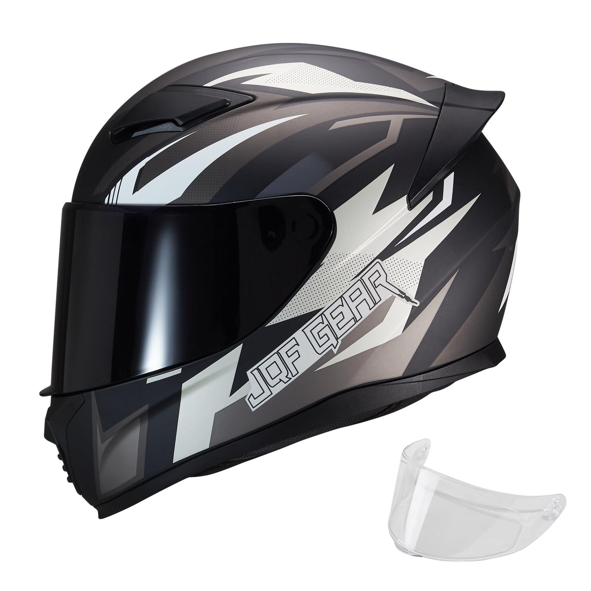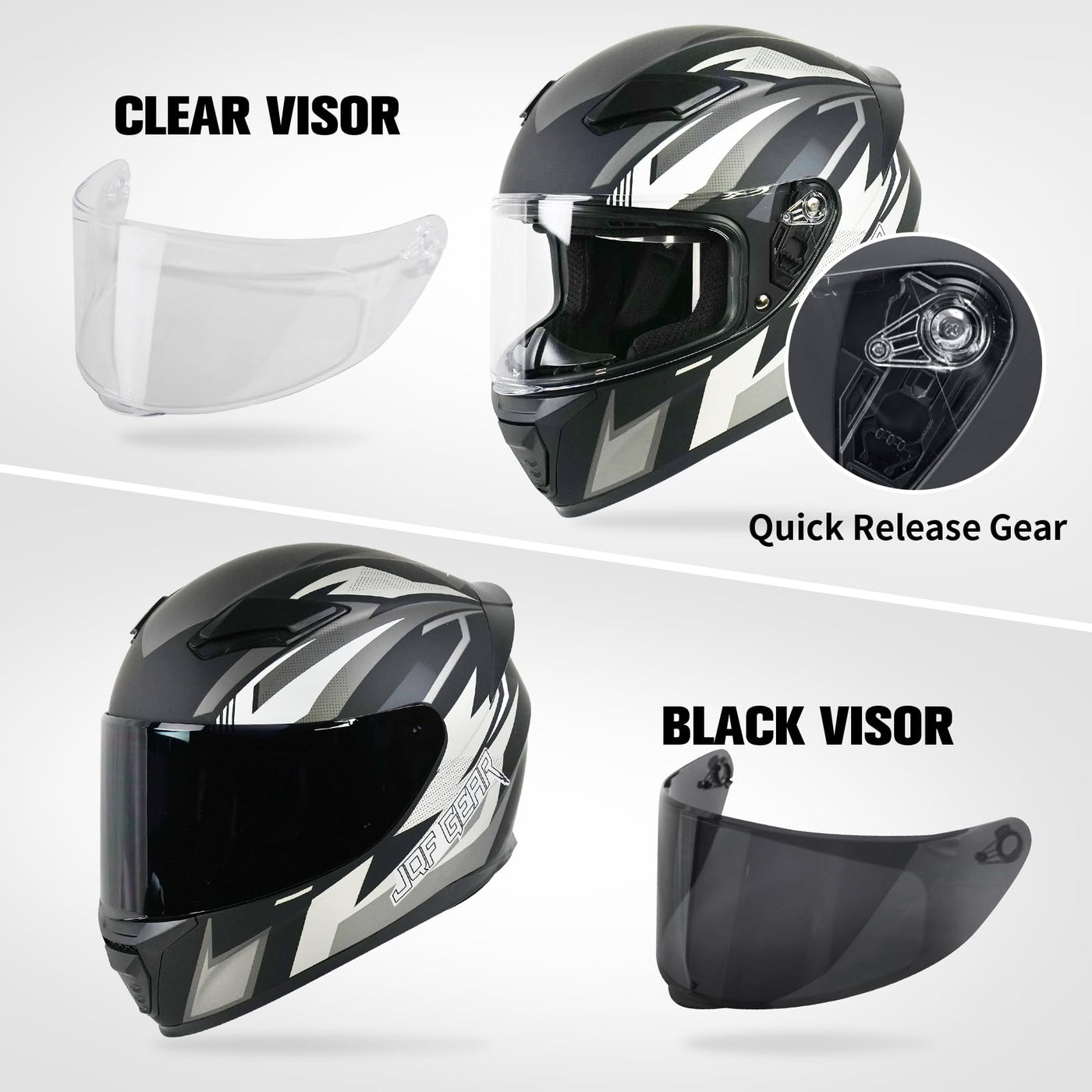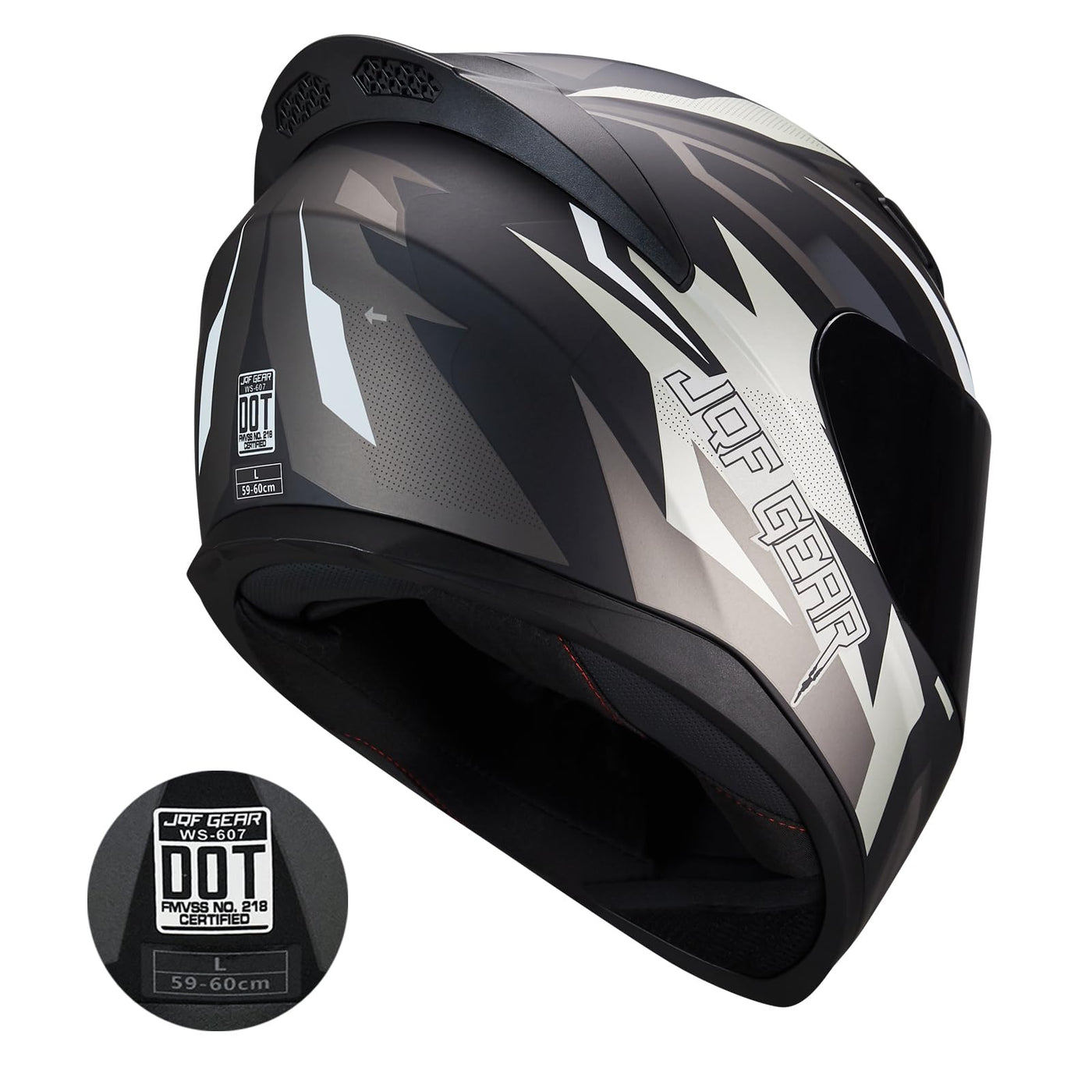 JQF Gear Full Face Motorcycle Helmet - DOT Approved Motorcycle Helmets for Adults Men and Women, Motorbike Racing Street Bike Helmet with Visor About Cascos Para Motos Para Hombre: Full face motorcycle helmet suits ATV, motocross, street bike, dirt bike, motorcycle, mountain bike, touring, dual sports and other outdoor riding activities. - Adult Size: Adult-S: 55-56 CM/ 21-5/8 - 22 inch Adult-M: 57-58 CM/ 22-1/2 - 22-7/8 inch Adult-L: 59-60 CM/ 23-1/4 - 23-5/8 inch Adult-XL: 61-62 CM/ 24 - 24-3/8 inch Adult-XXL: 63-64 CM/ 24-3/4 - 25-1/4 inch - Material: Lightweight ABS shell and Multi-Density EPS material for safe riding. - Quick release chin strap: The quick release chin strap design is easy and quick to use. - Removeable Lining: The lining of the helmets for adults are removable, washable and replaceable for comfort and breathability. - Removeable Visor: Each visor is removable and replaceable - Ventilation & Heat Dissipation: The full face helmet for adults has multiple vents designed to provide optimal ventilation and cooling, suitable for any riding environment in summer or winter. - 2 Specifications of Modular Motorcycle Helmet: We provide 2 packaging specifications: 1. Helmet with clear visor(Gray Ash/ Flat black B/ Flat black W/ Gloss White/ Thor/ Cube). 2. Helmet with clear and black visor(Gray Ash B/ Flat black BB/ Flat black WB/ Gloss White B/ Thor B/ Cube B). For Customer: If you have any questions or product problems when receive our racing helmets, please feel free to contact us. We will contact you and help to solve in 24 hours.