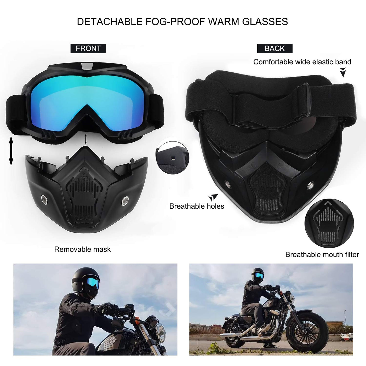 PROFESSIONAL PROTECTION - Our motorcycle goggles and removable face Mask increase the protection area, protect your eyes from the intrusion of gravel and dust, offering a clear perspective in sandy conditions and blocking wind and bugs | COMFORTABLE & BREATHABLE -The frame of ATV Motorcycle Helmet Goggles is made of TPU, with breathable sponge, soft and lightweight. The breathable mouth filter is helpful to ventilation and thermal dissipation, keep your face comfortable and safety | ADJUSTABLE ELASTIC HEADBAND - The long elastic headband made of durable nylon make compatible with all kinds of helmets, and fit different head size for women, men, youth, adults to ensure comfortable wearing and get good vision | Detachable & HELMET COMPATIBLE - Our full face moto goggles are compatible with most motorcycle helmets, like open helmets including 1/2 and 3/4 sizes. The mask is removable and the goggles can be used separately as needed, which is practical and convenient | APPLICATION: Motorcycle Goggles with Detachable Face Mask Used for outdoor activities, such as motorcycling, off-Road, Racing, Climbing, Fishing, Hunting, Jogging, CS. The arc design and high consistency cotton meet the need for a broad view and a comfortable wearing experience