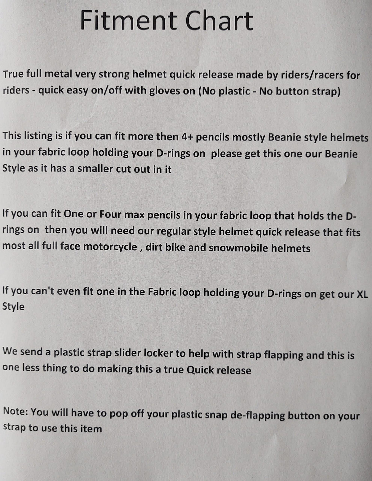 Fits Most Half Shell Beanie Helmets - Strongest Made True Full Metal Motorcycle Dirt Bike Helmet Quick Release Without A Weak Button Strap And No Stitching Needed - Rest Assured With The Number 1 Made Strongest Easiest To Use With Gloves On That Is Made By Bikers For Bikers. Please Read Below As Checking Your Helmet Is Really Easy To Make Sure This Will Fit Your Helmets Product Is For Adult Size Motorcycle Helmets - Safety Assured With Shubandit Quick Release Exceeds Dot Fmvss No. 218 Federal Motor Vehicle Safety Standards - Helps Stop Helmet Straps From Flapping This Quick Release Style Will Fit On Most Half Shell / Beanie Helmets/ Just Make Sure You Can Fit At Least Minimum 4 Plus Pencil Widths In The Fabric Loop Holding Your D-Rings On Cause This Is Where The Small Cut Out Fits On To Your Helmet Since The Cut Out Is Very Small On This Style Quick Release - - If You Can Only Fit Minimum One To Four Max Then Get Our Other Regular One With The Wider Cut Out Search Rydewear Quick Release It Will Say Fits 1 To 4 Pencil Widths- If You Have A Strap De Flapping Button On The End Of Your Strap You Will Have To Simply Just Pop It Off With A Screw Driver - It Is No Longer Needed With This Quick Release As It Comes With A Strap Slide That Stops Your Strap From Slapping Anyway. Simply Hooks On To Your D-Ring Fabric Loop - Please Check That You Can At Least Easily Fit Four Pencils In Your Loop That Holds The D-Rings On - If You Can Then You Can Simply Attach This Helmet Quick Release - If You Can'T Even Fit One Pencil In Your Fabric Loop Then Search Our Xl Rydewear Style - Helps Stop Helmet Straps From Flapping Not For Ski, Snowboard Or Bicycle Helmets -